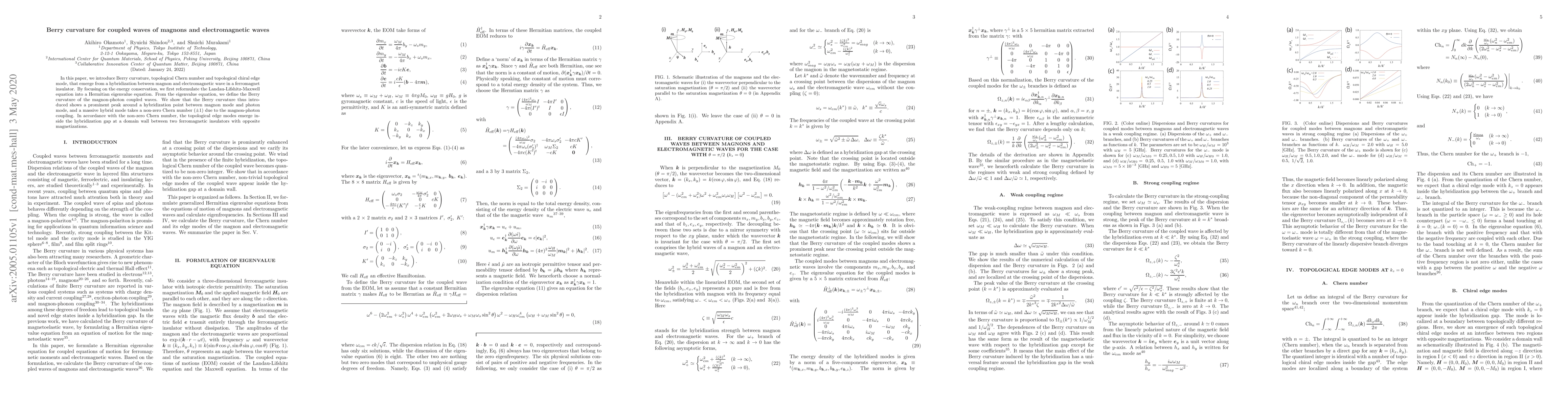 In this paper, we introduce Berry curvature, topological Chern number and topological chiral edge mode, that emerge from a hybridization between magnon and electromagnetic wave in a ferromagnet insulator. By focusing on the energy conservation, we first reformulate the Landau-Lifshitz-Maxwell equation into a Hermitian eigenvalue equation. From the eigenvalue equation, we define the Berry curvature of the magnon-photon coupled waves. We show that the Berry curvature thus introduced shows a prominent peak around a hybridization point between magnon mode and photon mode, and a massive hybrid mode takes a non-zero Chern number ($\pm 1$) due to the magnon-photon coupling. In accordance with the non-zero Chern number, the topological edge modes emerge inside the hybridization gap at a domain wall between two ferromagnetic insulators with opposite magnetizations.