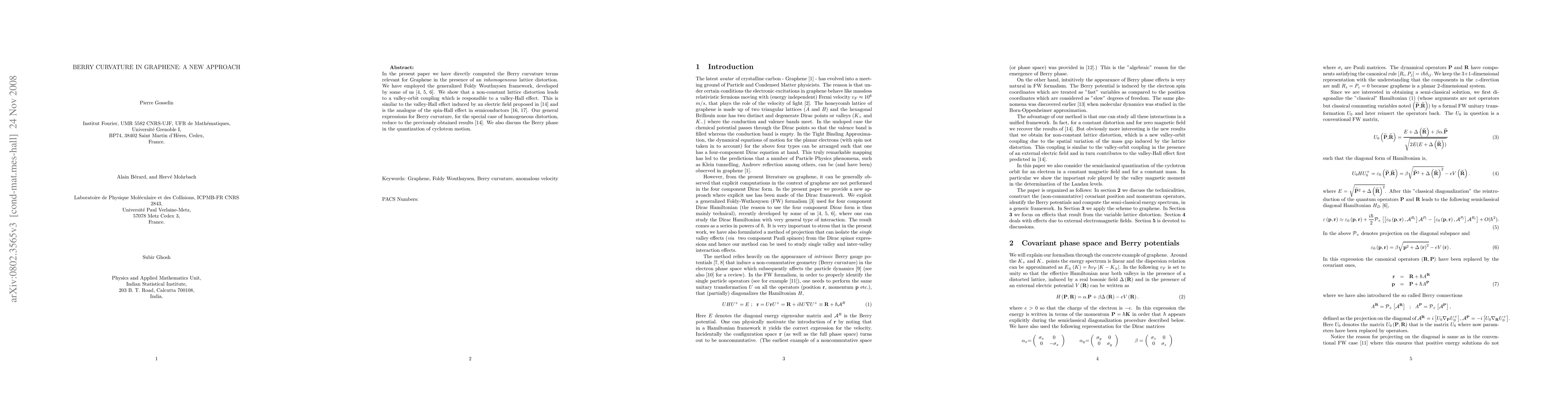 In the present paper we have directly computed the Berry curvature terms relevant for Graphene in the presence of an \textit{inhomogeneous} lattice distortion. We have employed the generalized Foldy Wouthuysen framework, developed by some of us \cite{ber0,ber1,ber2}. We show that a non-constant lattice distortion leads to a valley-orbit coupling which is responsible to a valley-Hall effect. This is similar to the valley-Hall effect induced by an electric field proposed in \cite{niu2} and is the analogue of the spin-Hall effect in semiconductors \cite{MURAKAMI, SINOVA}. Our general expressions for Berry curvature, for the special case of homogeneous distortion, reduce to the previously obtained results \cite{niu2}. We also discuss the Berry phase in the quantization of cyclotron motion.