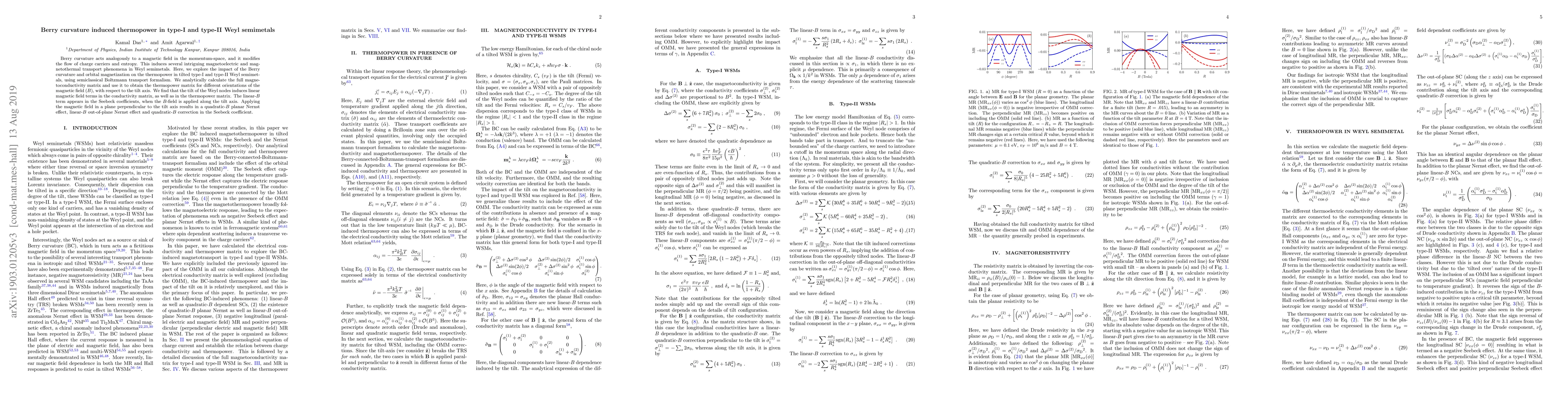 This paper investigates the thermopower in tilted type-I and type-II Weyl semimetals driven by Berry curvature effects, revealing linear and quadratic magnetic field dependencies in the conductivity and thermopower matrices. The study highlights distinct magnetothermal phenomena when the magnetic field is applied parallel or perpendicular to the tilt axis.