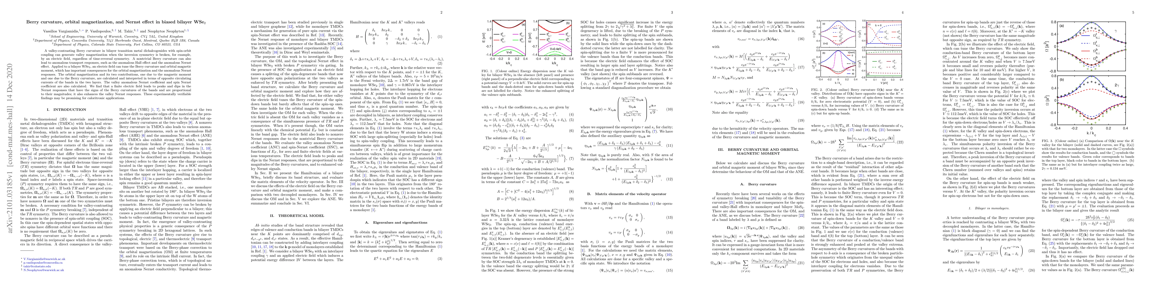 This paper investigates the Berry curvature, orbital magnetization, and Nernst effect in biased bilayer WSe$_2$, revealing that an electric field can tune the Berry curvature and orbital magnetic moment, leading to significant orbital magnetization and anomalous Nernst responses, with potential applications in caloritronics.