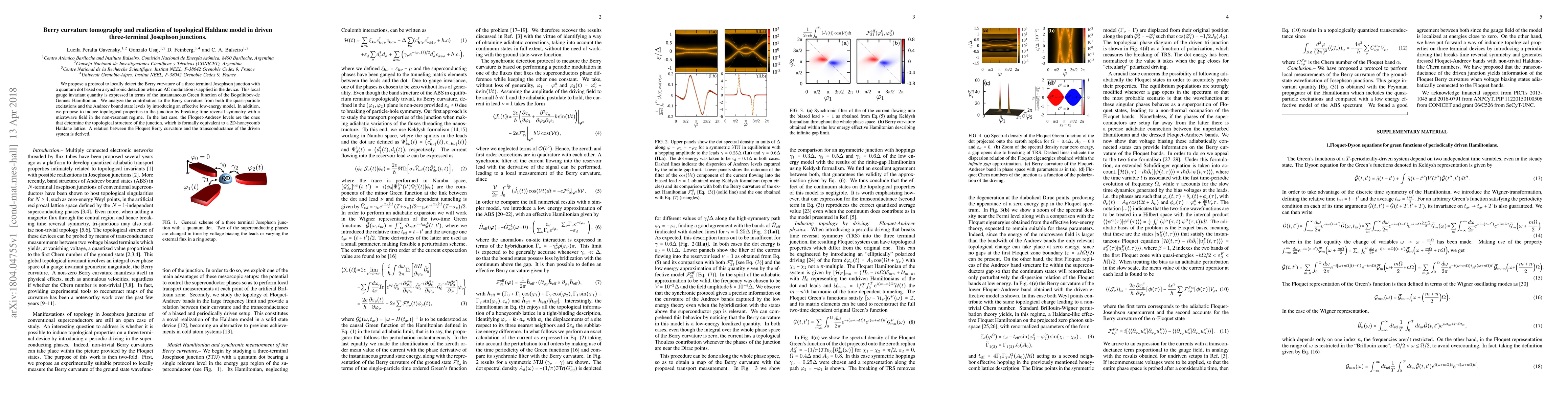 This paper proposes a method to detect the Berry curvature in a three-terminal Josephson junction using a quantum dot and AC modulation, revealing contributions from quasi-particle and Andreev states. It also introduces a protocol to induce topological properties by applying a microwave field, resulting in a system equivalent to a Haldane model.