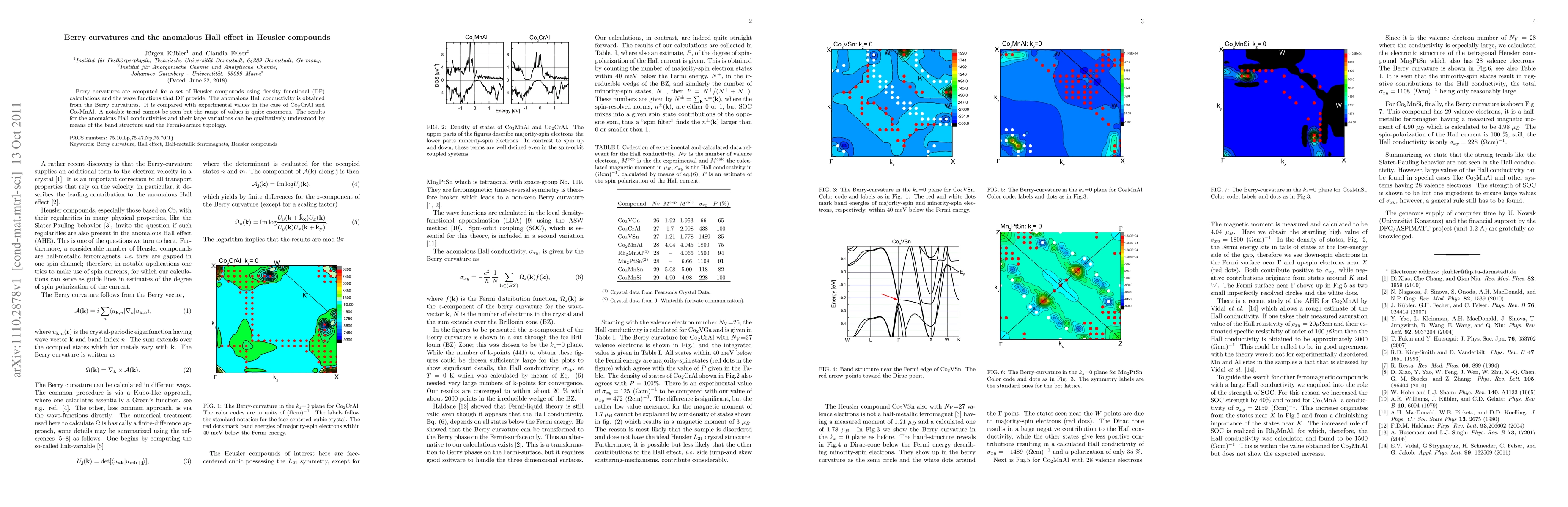 Berry curvatures are computed for a set of Heusler compounds using density functional (DF) calculations and the wave functions that DF provide. The anomalous Hall conductivity is obtained from the Berry curvatures. It is compared with experimental values in the case of Co$_2$CrAl and Co$_2$MnAl. A notable trend cannot be seen but the range of values is quite enormous. The results for the anomalous Hall conductivities and their large variations can be qualitatively understood by means of the band structure and the Fermi-surface topology.