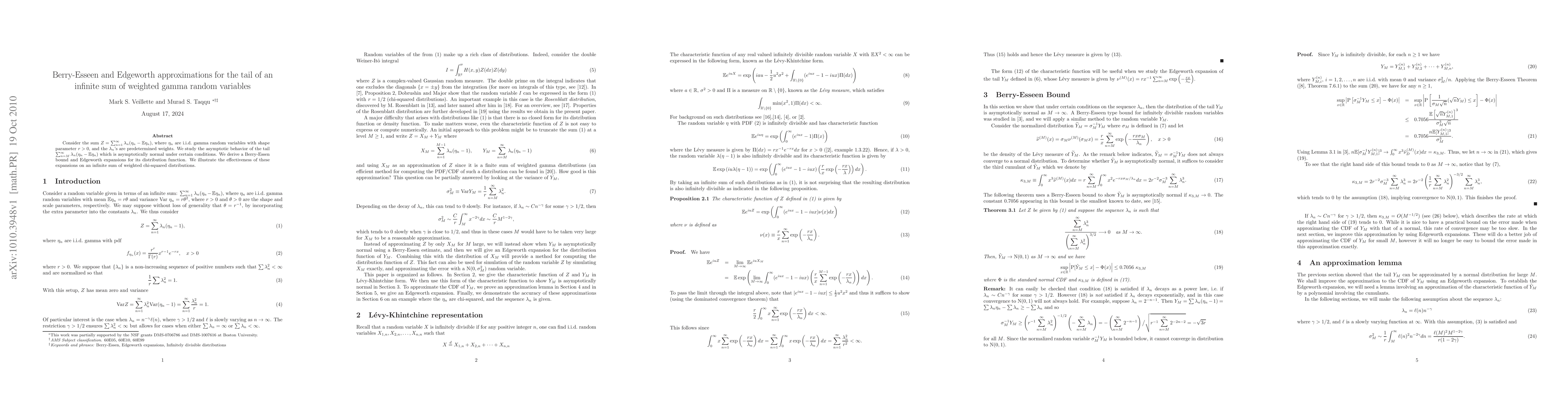Consider the sum $Z = \sum_{n=1}^\infty \lambda_n (\eta_n - \mathbb{E}\eta_n)$, where $\eta_n$ are i.i.d.~gamma random variables with shape parameter $r > 0$, and the $\lambda_n$'s are predetermined weights. We study the asymptotic behavior of the tail $\sum_{n=M}^\infty \lambda_n (\eta_n - \mathbb{E}\eta_n)$ which is asymptotically normal under certain conditions. We derive a Berry-Essen bound and Edgeworth expansions for its distribution function. We illustrate the effectiveness of these expansions on an infinite sum of weighted chi-squared distributions.