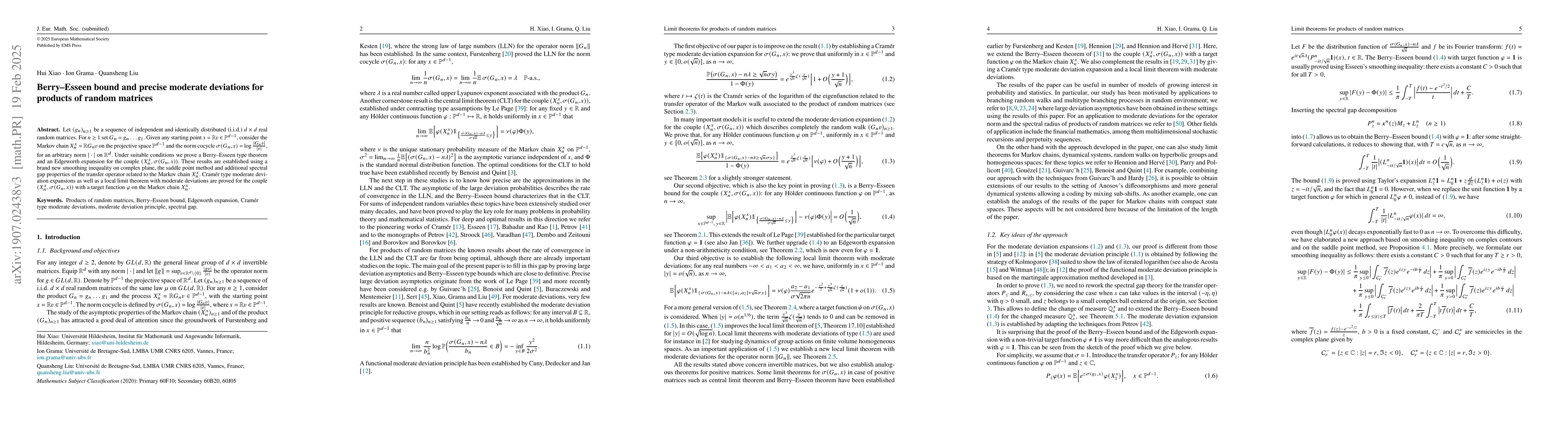 This paper establishes Berry-Esseen bounds and precise moderate deviation results for products of random matrices, proving an Edgeworth expansion and Cramér-type moderate deviation expansions for the sequence $(X_n^x, \log |G_n x|)$ using novel smoothing inequalities and spectral properties.