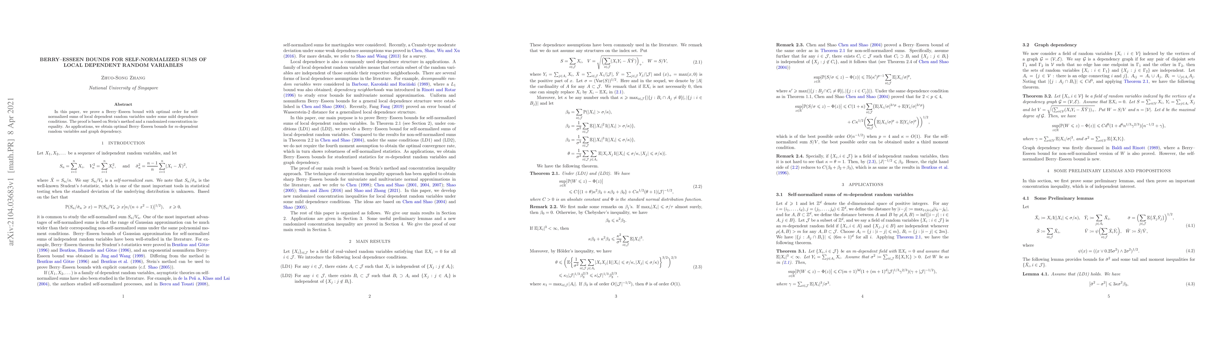 This paper establishes optimal Berry-Esseen bounds for self-normalized sums of locally dependent random variables using Stein's method and a randomized concentration inequality, with applications to $m$-dependent random variables and graph dependency.