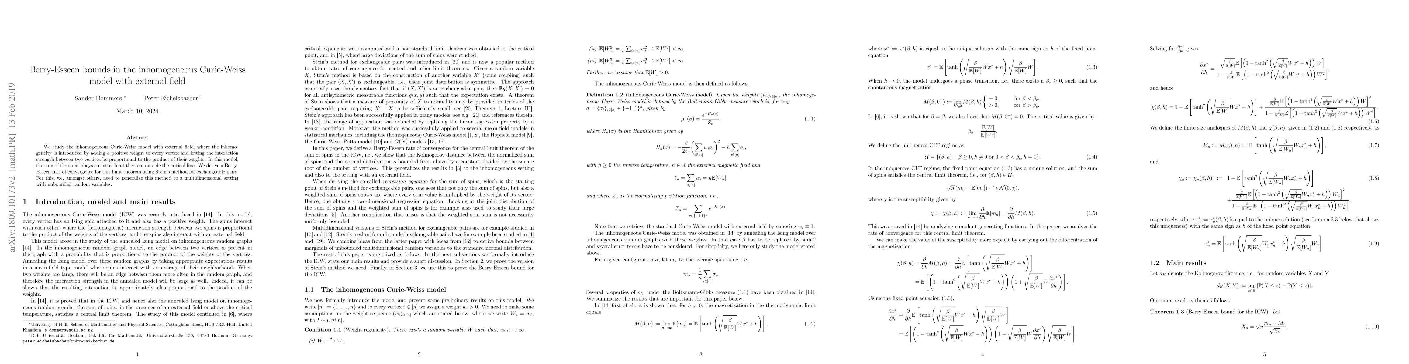 This paper investigates the inhomogeneous Curie-Weiss model with external field, deriving a Berry-Esseen rate of convergence for the central limit theorem of spin sums outside the critical line using Stein's method for exchangeable pairs, which is extended to a multidimensional setting with unbounded random variables.