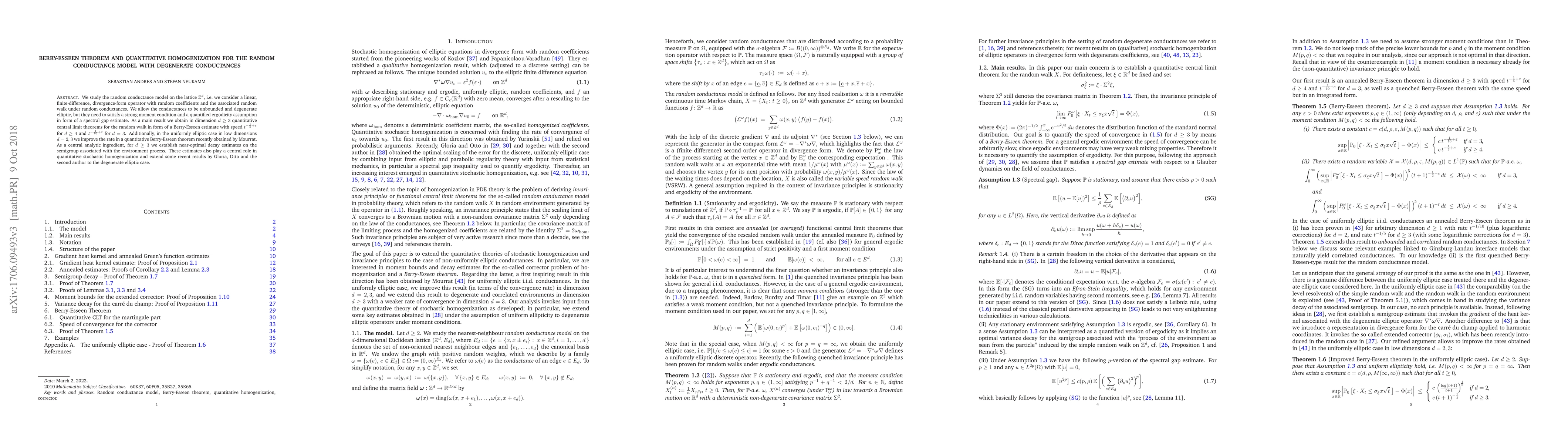We study the random conductance model on the lattice $\mathbb{Z}^d$, i.e. we consider a linear, finite-difference, divergence-form operator with random coefficients and the associated random walk under random conductances. We allow the conductances to be unbounded and degenerate elliptic, but they need to satisfy a strong moment condition and a quantified ergodicity assumption in form of a spectral gap estimate. As a main result we obtain in dimension $d\geq 3$ quantitative central limit theorems for the random walk in form of a Berry-Esseen estimate with speed $t^{-\frac 1 5+\varepsilon}$ for $d\geq 4$ and $t^{-\frac{1}{10}+\varepsilon}$ for $d=3$. Additionally, in the uniformly elliptic case in low dimensions $d=2,3$ we improve the rate in a quantitative Berry-Esseen theorem recently obtained by Mourrat. As a central analytic ingredient, for $d\geq 3$ we establish near-optimal decay estimates on the semigroup associated with the environment process. These estimates also play a central role in quantitative stochastic homogenization and extend some recent results by Gloria, Otto and the second author to the degenerate elliptic case.