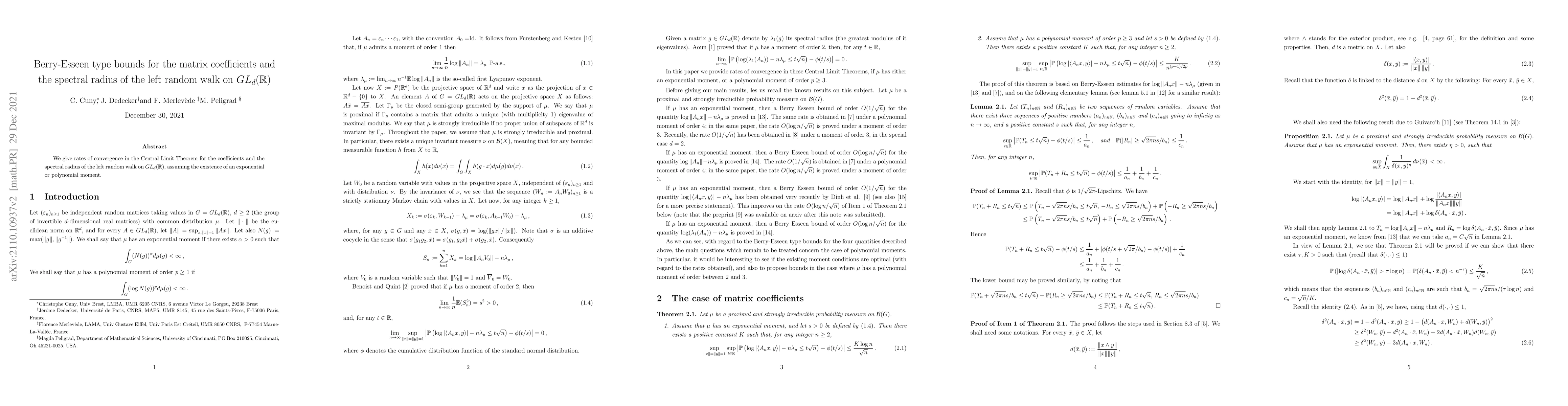 This paper establishes rates of convergence in the Central Limit Theorem for coefficients and spectral radius of the left random walk on GLd(R), with moments assuming exponential or polynomial form.