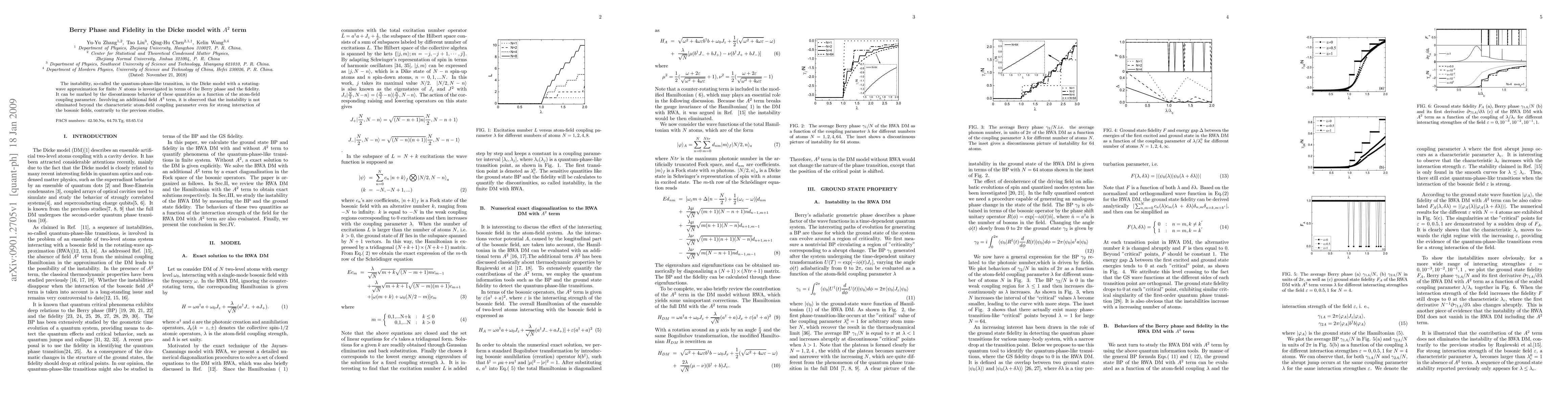 The instability, so-called the quantum-phase-like transition, in the Dicke model with a rotating-wave approximation for finite $N$ atoms is investigated in terms of the Berry phase and the fidelity. It can be marked by the discontinuous behavior of these quantities as a function of the atom-field coupling parameter. Involving an additional field $A^{2}$ term, it is observed that the instability is not eliminated beyond the characteristic atom-field coupling parameter even for strong interaction of the bosonic fields, contrarily to the previous studies.