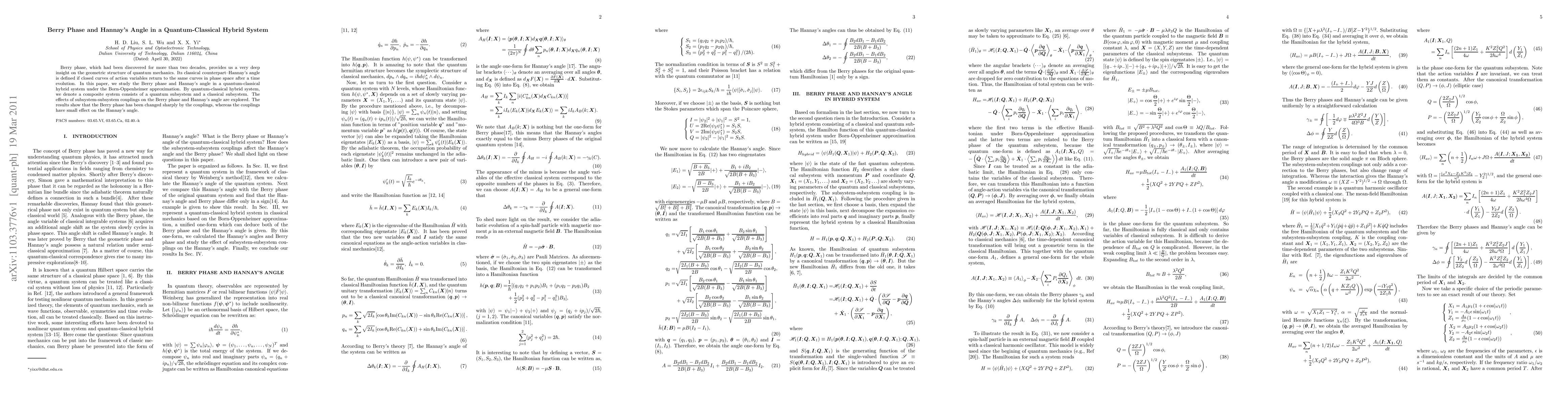 This paper investigates the Berry phase and Hannay's angle in a quantum-classical hybrid system, revealing that subsystem-subsystem couplings significantly alter the Berry phase but have a minimal impact on Hannay's angle under the Born-Oppenheimer approximation.