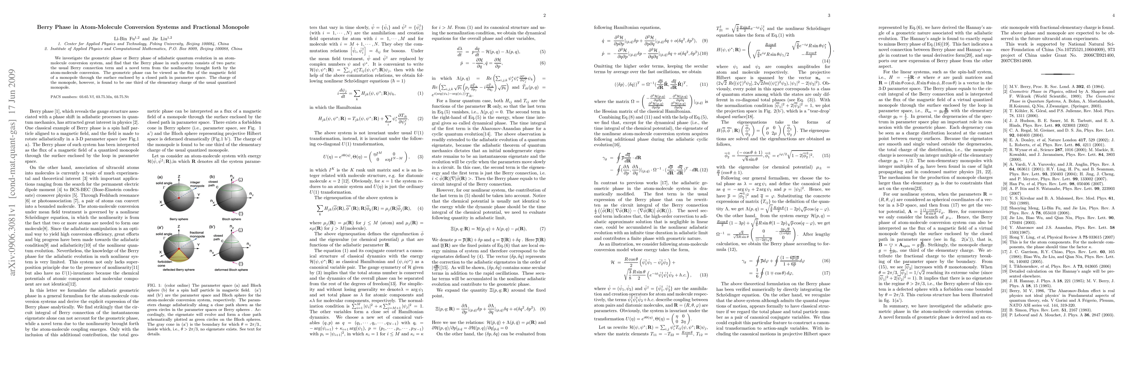 This paper explores the Berry phase in atom-molecule conversion systems, identifying two components: a traditional Berry connection term and a new term due to the conversion nonlinearity. The phase can be interpreted as the flux of a fractional monopole’s magnetic field, with a monopole charge one-third of the elementary charge.