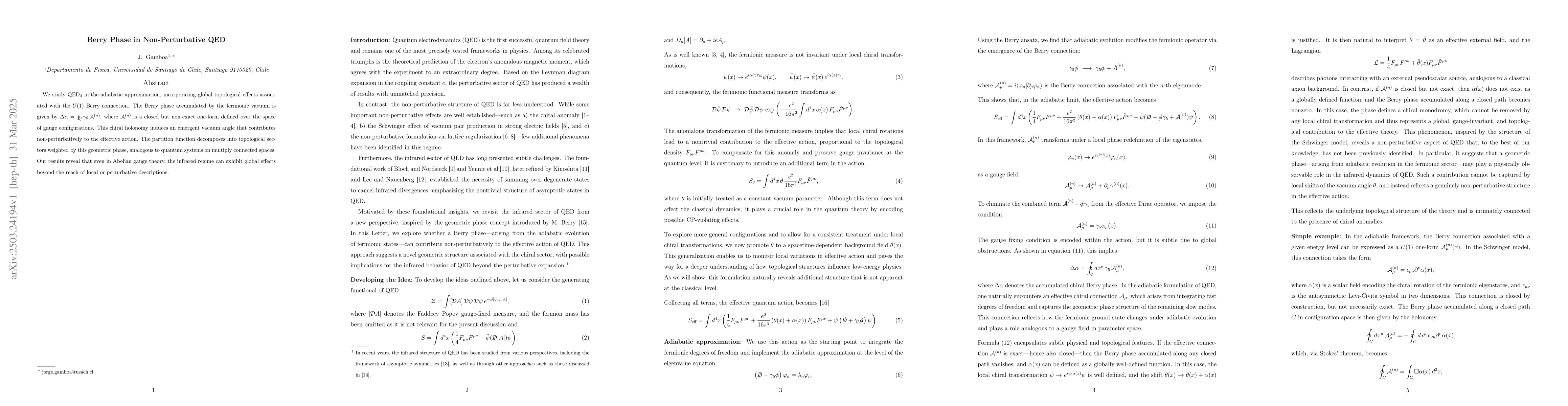 The paper introduces a novel method to incorporate Berry phase effects in non-perturbative QED, revealing topological sectors in the partition function and an emergent vacuum angle.