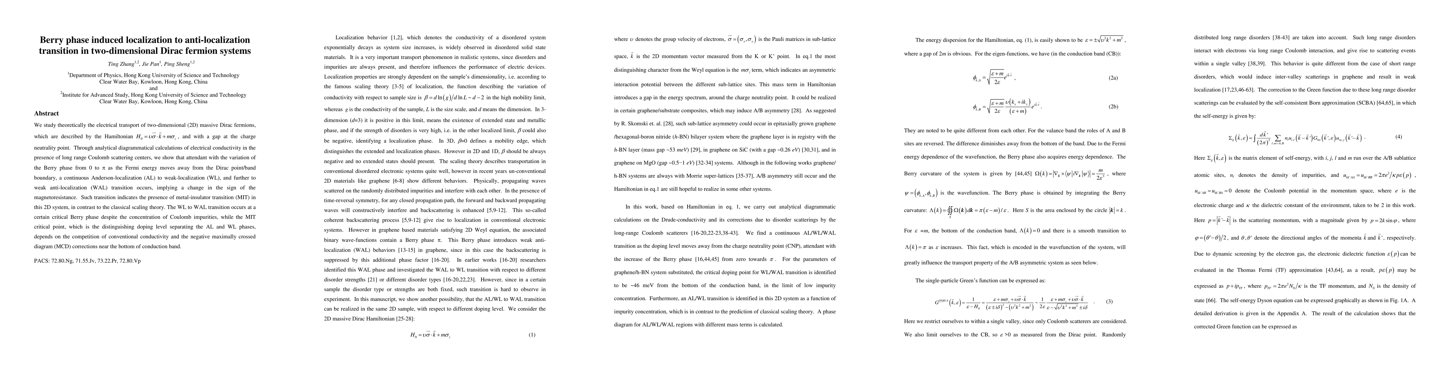 This paper investigates the electrical transport in 2D massive Dirac fermions, showing that varying the Berry phase from 0 to π induces a transition from Anderson localization to weak anti-localization, signaling a metal-insulator transition contrary to classical scaling theory. The transition occurs at a critical Berry phase, independent of impurity concentration.