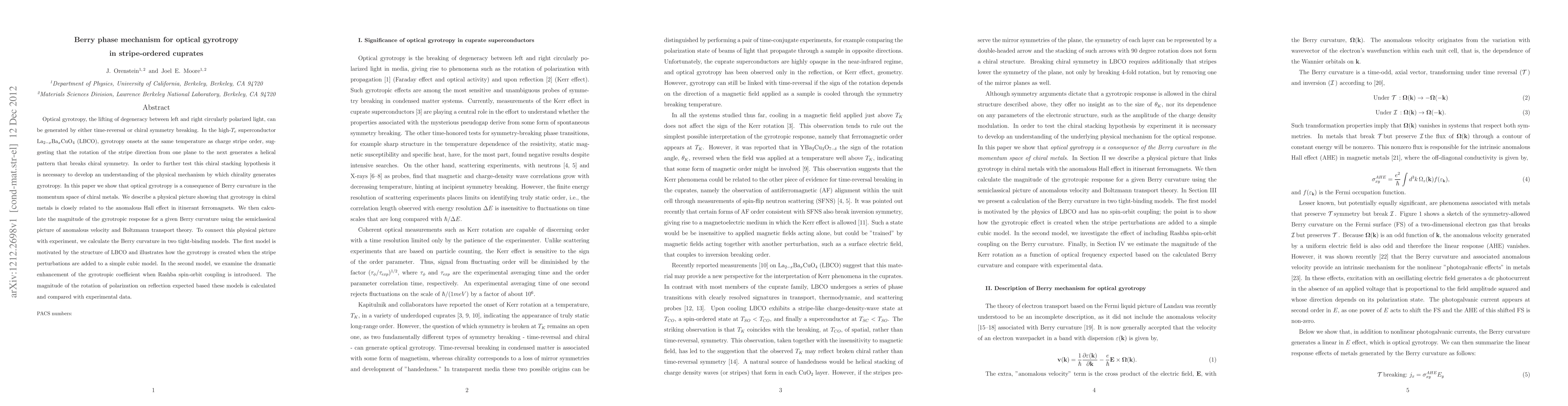 This paper demonstrates that optical gyrotropy in stripe-ordered cuprates arises from Berry curvature in the momentum space of chiral metals, akin to the anomalous Hall effect. The authors calculate the gyrotropic response using semiclassical models and tight-binding models, showing how stripe perturbations and Rashba spin-orbit coupling enhance this effect, which is then compared with experimental observations.