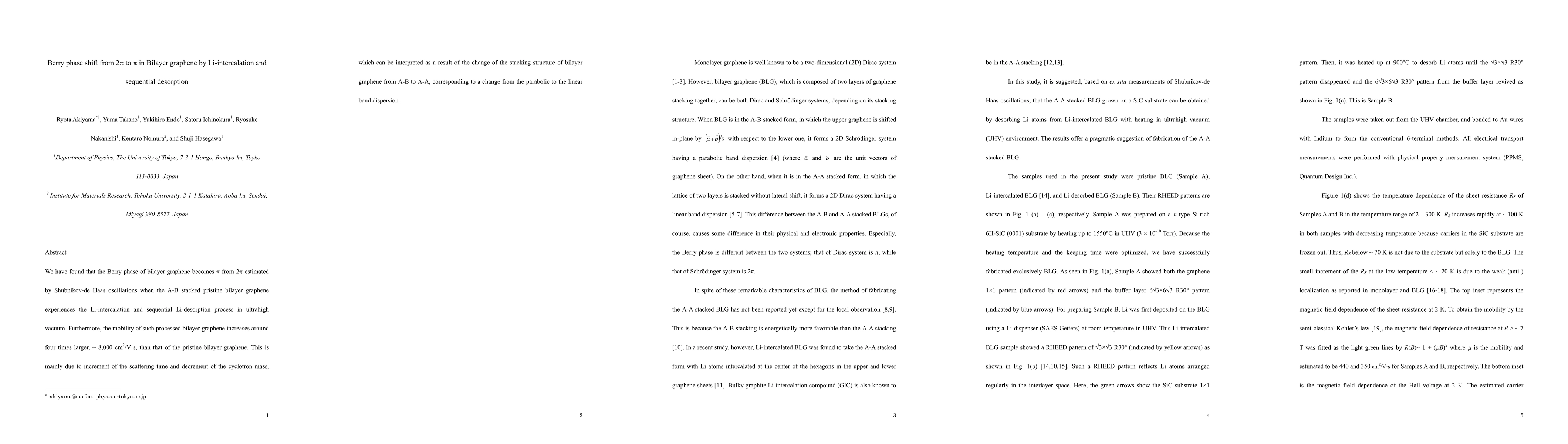We have found that the Berry phase of bilayer graphene becomes from 2$\pi$ estimated by Shubnikov-de Haas oscillations when the A-B stacked pristine bilayer graphene experiences the Li-intercalation and sequential Li-desorption process in ultrahigh vacuum. Furthermore, the mobility of such processed bilayer graphene increases around four times larger, ~ 8,000 cm2/V$\cdot$s, than that of the pristine bilayer graphene. This is mainly due to increment of the scattering time and decrement of the cyclotron mass, which can be interpreted as a result of the change of the stacking structure of bilayer graphene from A-B to A-A, corresponding to a change from the parabolic to the linear band dispersion.