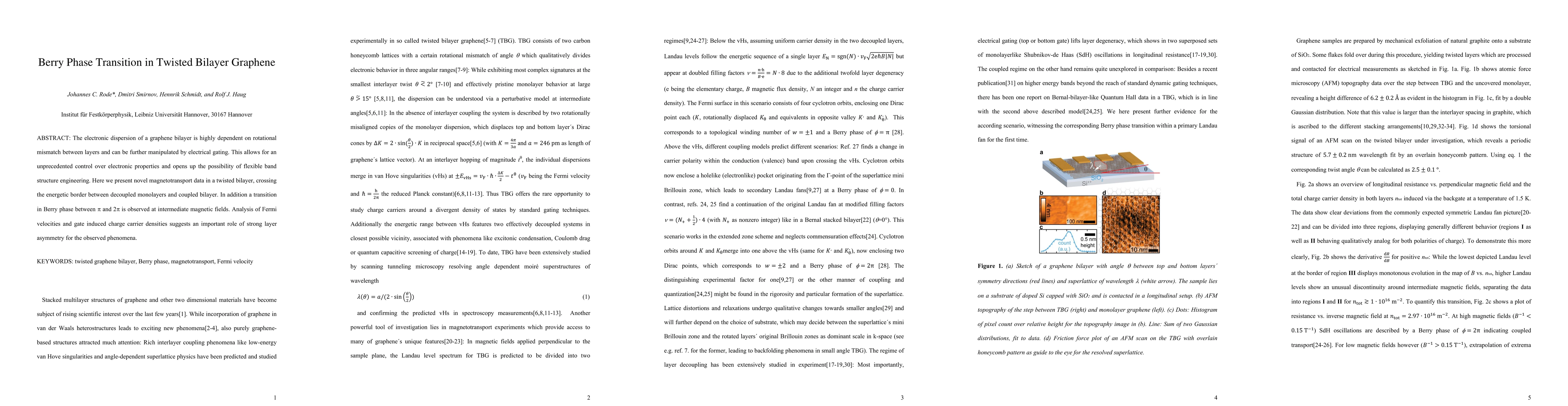 This study reveals a Berry phase transition in twisted bilayer graphene, showing a shift from pi to 2pi as magnetic fields change. The research highlights the influence of layer asymmetry and electrical gating on the electronic properties and band structure engineering of the material.
