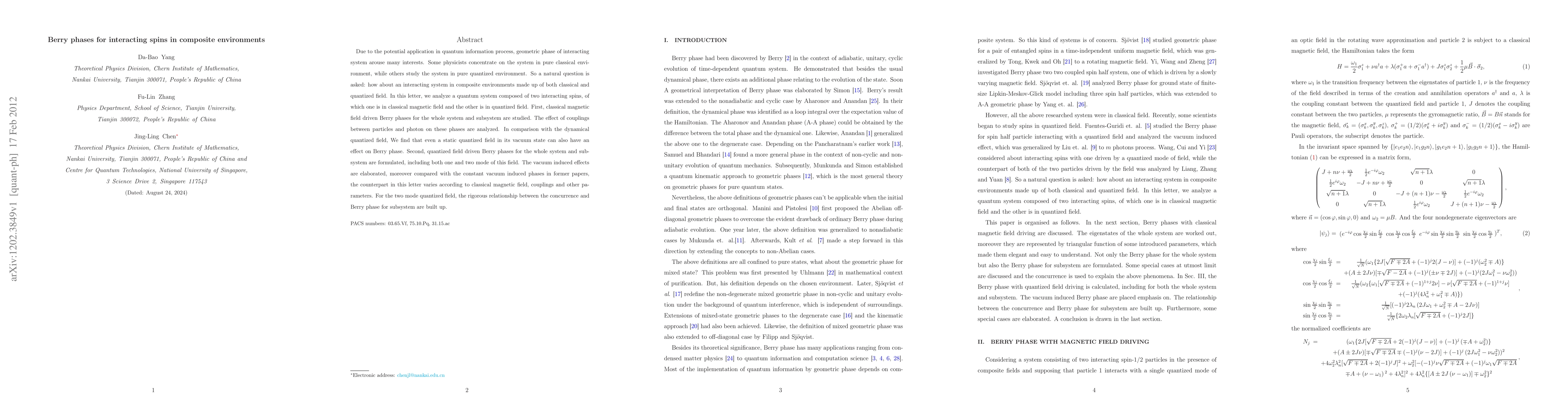 Due to the potential application in quantum information process, geometric phase of interacting system arouse many interests. Some physicists concentrate on the system in pure classical envi- ronment, while others study the system in pure quantized environment. So a natural question is asked: how about an interacting system in composite environments made up of both classical and quantized field. In this letter, we analyze a quantum system composed of two interacting spins, of which one is in classical magnetic field and the other is in quantized field. First, classical magnetic field driven Berry phases for the whole system and subsystem are studied. The effect of couplings between particles and photon on these phases are analyzed. In comparison with the dynamical quantized field, We find that even a static quantized field in its vacuum state can also have an effect on Berry phase. Second, quantized field driven Berry phases for the whole system and sub- system are formulated, including both one and two mode of this field. The vacuum induced effects are elaborated, moreover compared with the constant vacuum induced phases in former papers, the counterpart in this letter varies according to classical magnetic field, couplings and other pa- rameters. For the two mode quantized field, the rigorous relationship between the concurrence and Berry phase for subsystem are built up.