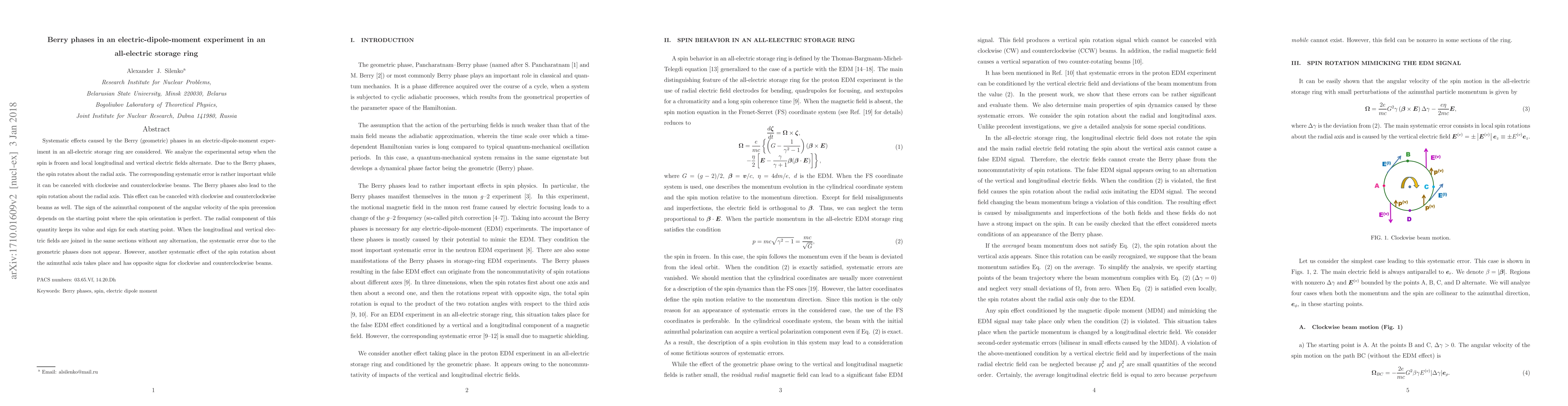 This paper investigates the systematic effects of Berry phases in an electric-dipole-moment experiment within an all-electric storage ring, showing that spin rotation due to these phases can be canceled using opposite beam directions. It also highlights that when electric fields are not alternated, a new systematic spin rotation effect occurs, differing in sign between clockwise and counterclockwise beams.