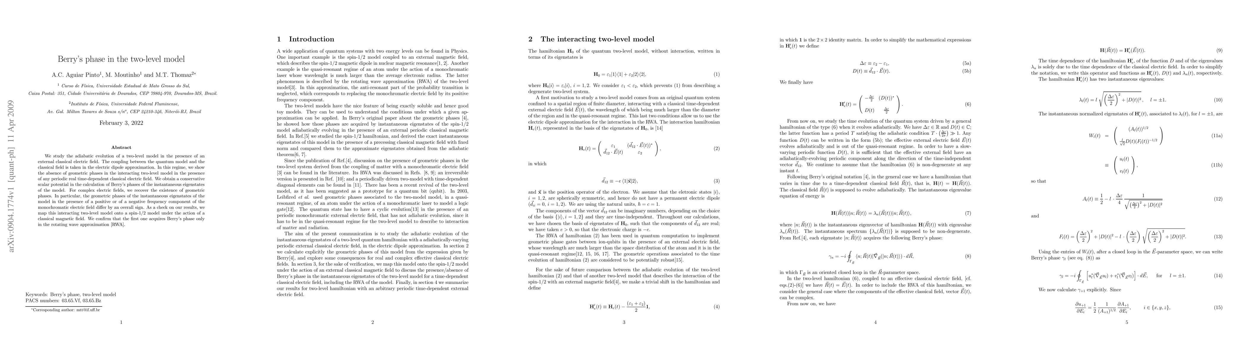 We study the adiabatic evolution of a two-level model in the presence of an external classical electric field. The coupling between the quantum model and the classical field is taken in the electric dipole approximation. In this regime, we show the absence of geometric phases in the interacting two-level model in the presence of any periodic real time-dependent classical electric field. We obtain a conservative scalar potential in the calculation of Berry's phases of the instantaneous eigenstates of the model. For complex electric fields, we recover the existence of geometric phases. In particular, the geometric phases of the instantaneous eigenstates of the model in the presence of a positive or of a negative frequency component of the monochromatic electric field differ by an overall sign. As a check on our results, we map this interacting two-level model onto a spin-1/2 model under the action of a classical magnetic field. We confirm that the first one acquires Berry's phase only in the rotating wave approximation [RWA].