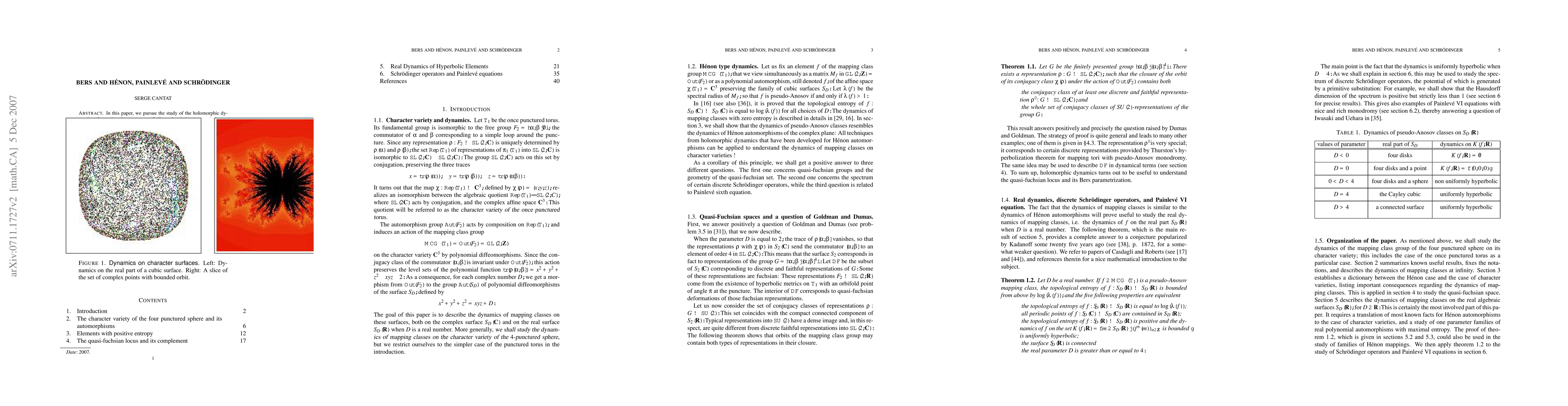 We study the dynamics of mapping class groups on 2-dimensional character varieties. We shall show that the dynamics of pseudo-Anosov mapping classes resembles in many ways the dynamics of H\'enon mappings, and then apply this idea to answer open questions concerning the geometry of discrete and faithful representations, Painlev\'e sixth equation, and discrete Schroedinger operators.