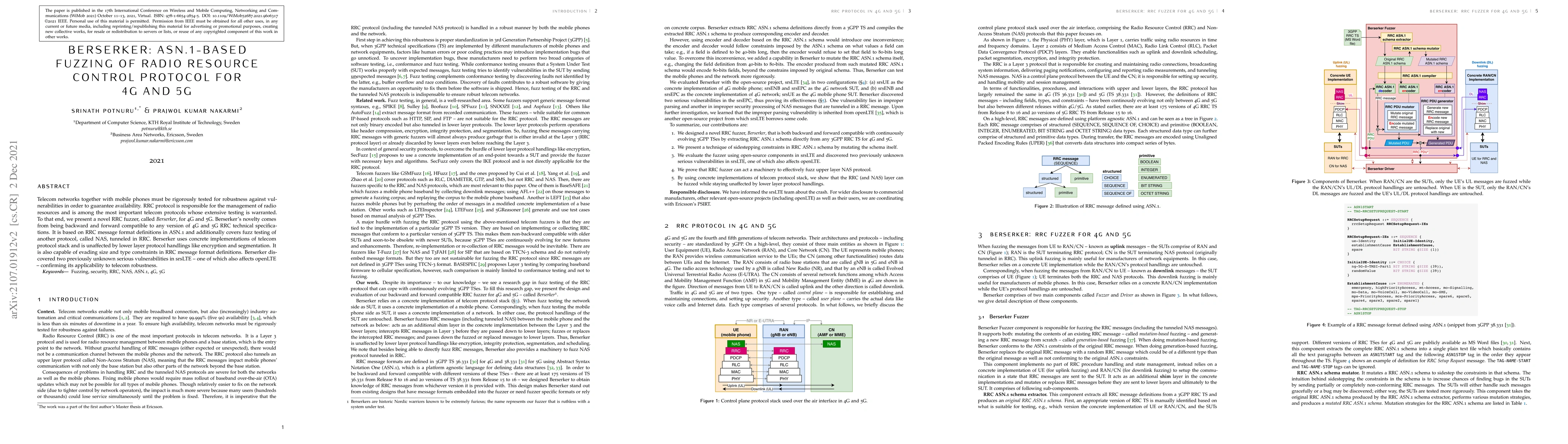 Researchers introduced Berserker, a novel ASN.1-based fuzzer for 4G and 5G RRC protocols, which discovered two previously unknown serious vulnerabilities in srsLTE and openLTE.