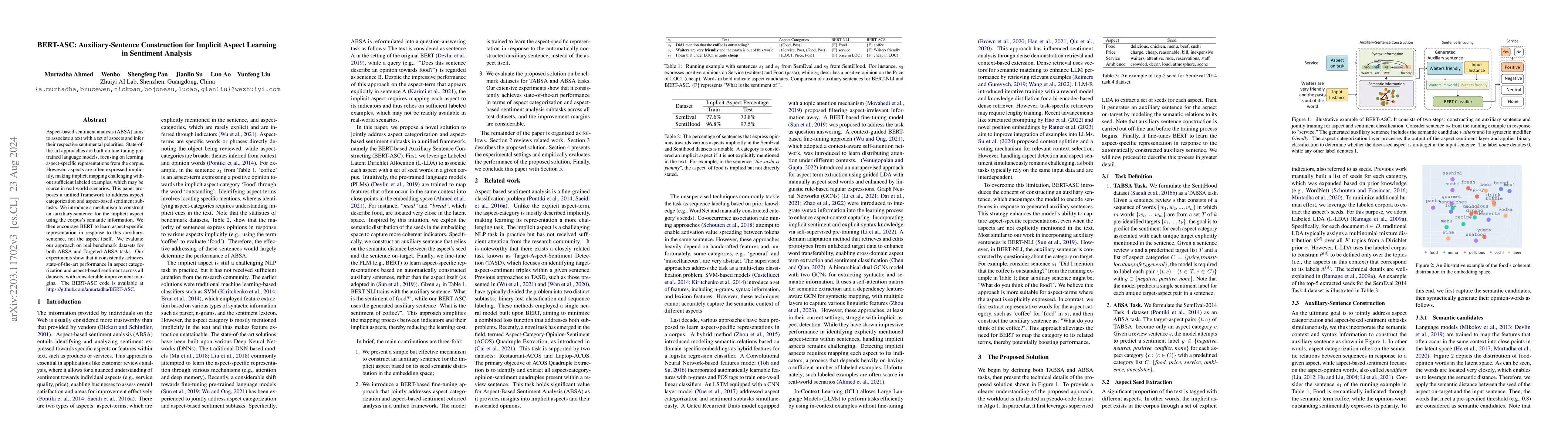 This paper proposes BERT-ASC, a framework for implicit aspect representation learning in aspect-based sentiment analysis (ABSA) by constructing auxiliary sentences to represent implicit aspects. The approach leverages BERT to learn aspect-specific representations from these auxiliary sentences, achieving state-of-the-art performance on benchmark datasets.