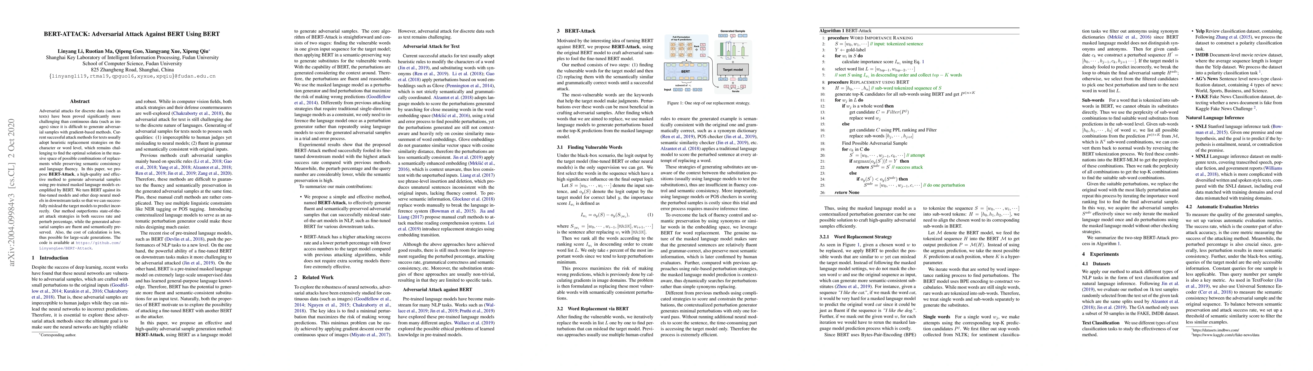 BERT-ATTACK proposes a novel adversarial attack method using BERT to generate high-quality, semantically consistent adversarial samples that effectively mislead BERT-based models. The method outperforms existing strategies in success rate and efficiency, making it feasible for large-scale applications.