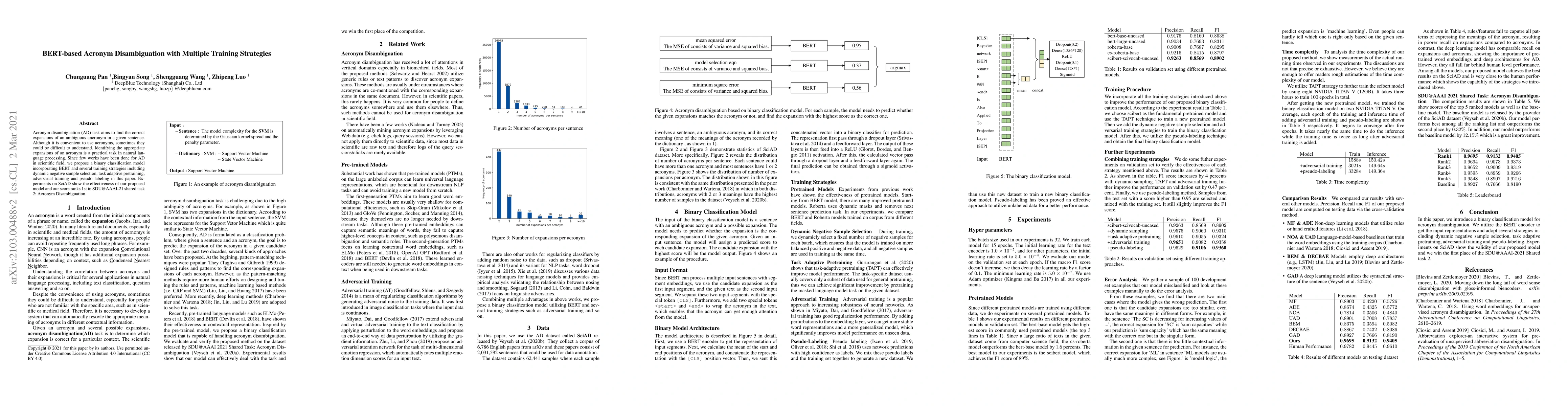 This paper proposes a BERT-based model for acronym disambiguation using multiple training strategies, including dynamic negative sample selection, task adaptive pretraining, adversarial training, and pseudo labeling. The model achieves top performance in the SDU@AAAI-21 shared task, demonstrating its effectiveness.