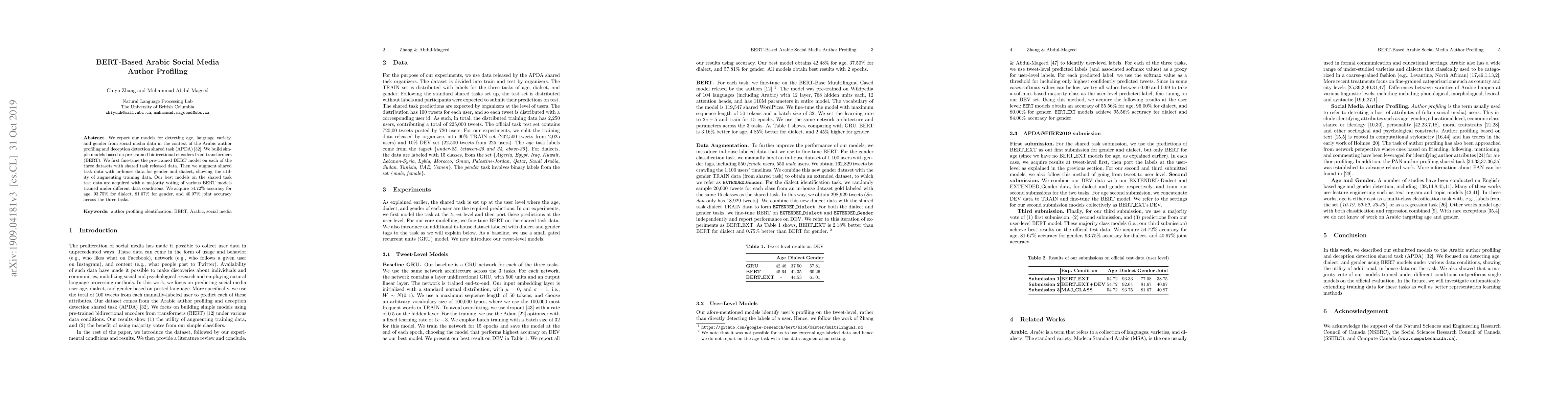 We report our models for detecting age, language variety, and gender from social media data in the context of the Arabic author profiling and deception detection shared task (APDA). We build simple models based on pre-trained bidirectional encoders from transformers (BERT). We first fine-tune the pre-trained BERT model on each of the three datasets with shared task released data. Then we augment shared task data with in-house data for gender and dialect, showing the utility of augmenting training data. Our best models on the shared task test data are acquired with a majority voting of various BERT models trained under different data conditions. We acquire 54.72% accuracy for age, 93.75% for dialect, 81.67% for gender, and 40.97% joint accuracy across the three tasks.