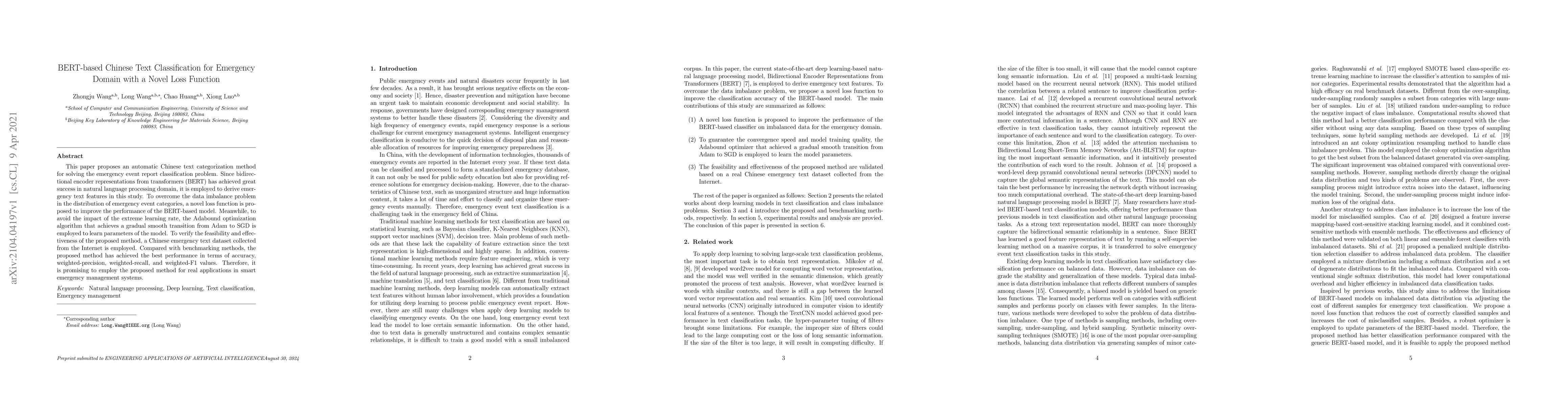 A novel BERT-based model proposes a Chinese text classification method for emergency event report classification with improved performance using a proposed loss function and Adabound optimization algorithm.