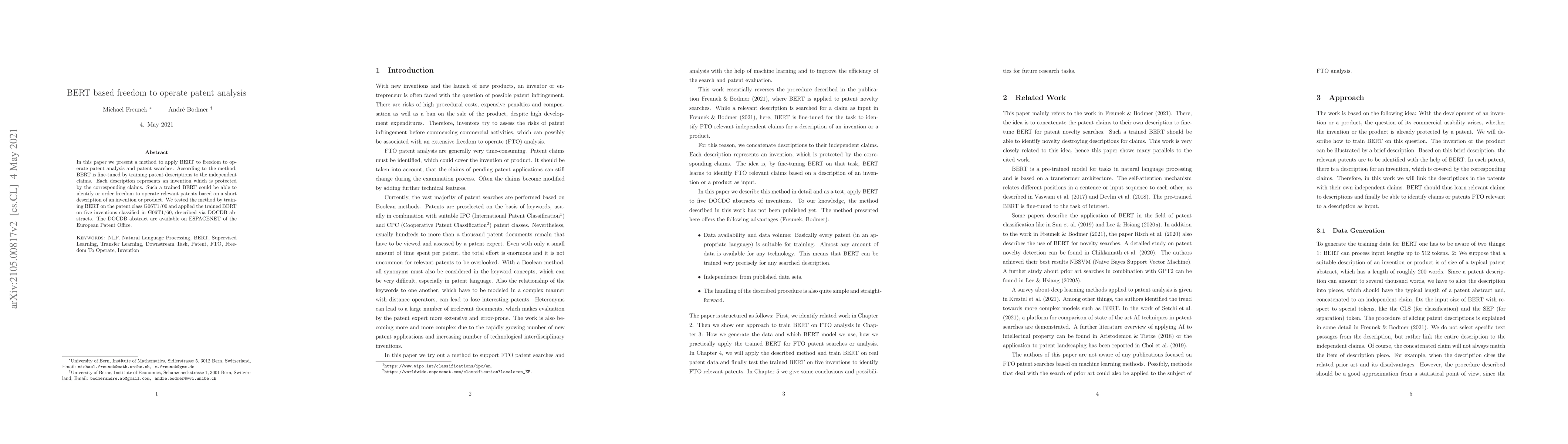 In this paper we present a method to apply BERT to freedom to operate patent analysis and patent searches. According to the method, BERT is fine-tuned by training patent descriptions to the independent claims. Each description represents an invention which is protected by the corresponding claims. Such a trained BERT could be able to identify or order freedom to operate relevant patents based on a short description of an invention or product. We tested the method by training BERT on the patent class G06T1/00 and applied the trained BERT on five inventions classified in G06T1/60, described via DOCDB abstracts. The DOCDB abstract are available on ESPACENET of the European Patent Office.