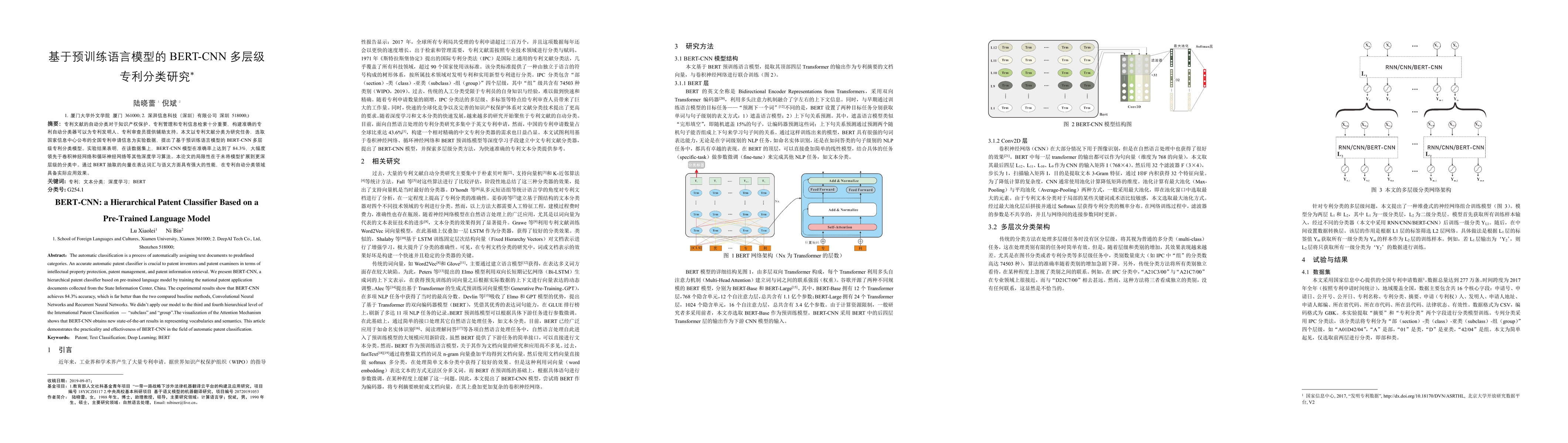 BERT-CNN is a hierarchical patent classifier leveraging a pre-trained language model to achieve 84.3% accuracy in patent document classification, outperforming CNN and RNN baselines. The model's attention mechanism enhances semantic representation, showcasing its effectiveness in automatic patent classification.