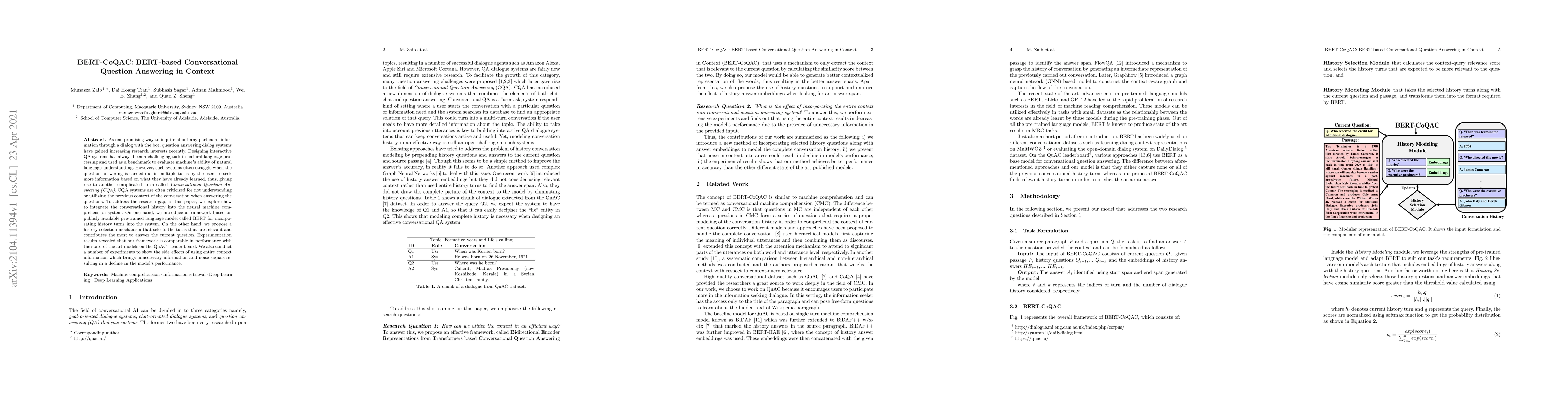 This paper introduces a BERT-based framework for Conversational Question Answering (CQA) that effectively incorporates conversation history into the system, achieving comparable performance to state-of-the-art models.