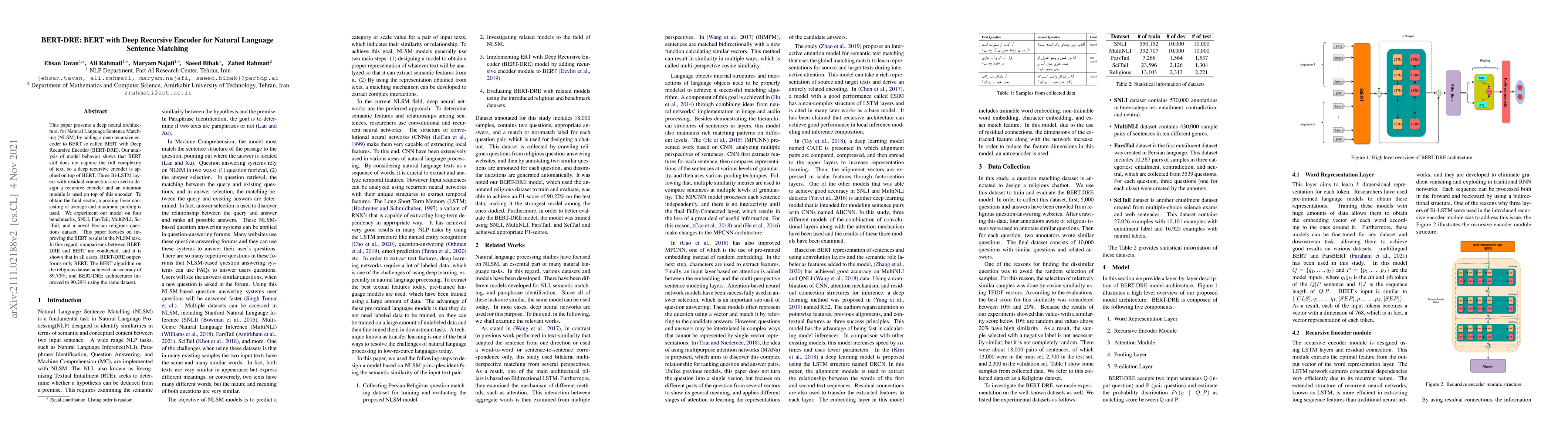 This paper presents a deep neural architecture, for Natural Language Sentence Matching (NLSM) by adding a deep recursive encoder to BERT so called BERT with Deep Recursive Encoder (BERT-DRE). Our analysis of model behavior shows that BERT still does not capture the full complexity of text, so a deep recursive encoder is applied on top of BERT. Three Bi-LSTM layers with residual connection are used to design a recursive encoder and an attention module is used on top of this encoder. To obtain the final vector, a pooling layer consisting of average and maximum pooling is used. We experiment our model on four benchmarks, SNLI, FarsTail, MultiNLI, SciTail, and a novel Persian religious questions dataset. This paper focuses on improving the BERT results in the NLSM task. In this regard, comparisons between BERT-DRE and BERT are conducted, and it is shown that in all cases, BERT-DRE outperforms BERT. The BERT algorithm on the religious dataset achieved an accuracy of 89.70%, and BERT-DRE architectures improved to 90.29% using the same dataset.
