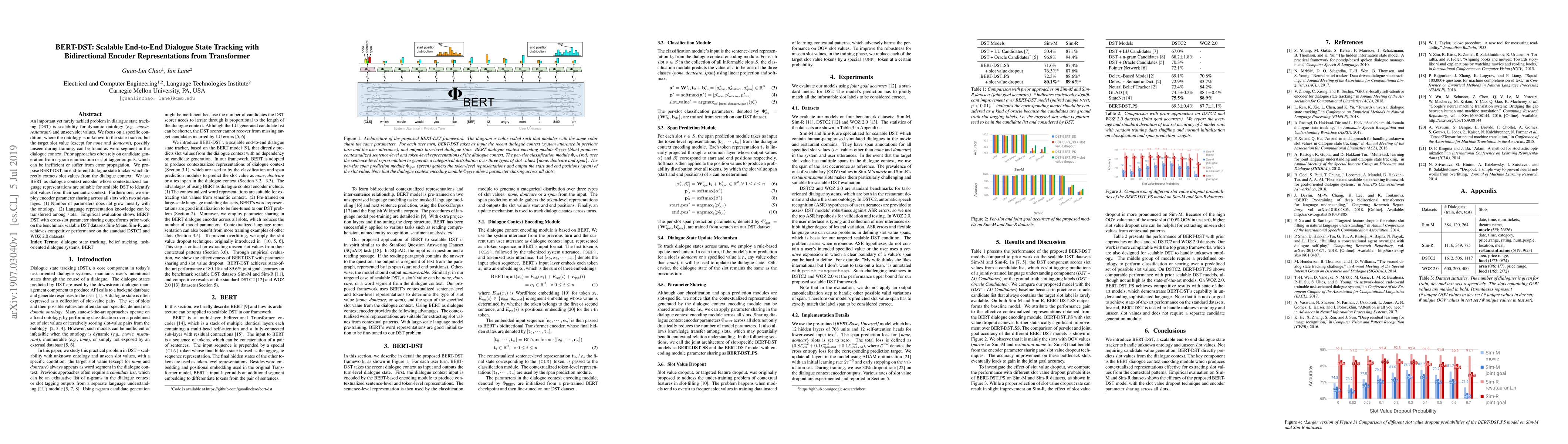 BERT-DST is an end-to-end dialogue state tracker that leverages BERT for contextualized language representations to identify slot values from dialogue context, achieving scalability and competitive performance on multiple datasets. It employs cross-slot parameter sharing to avoid linear parameter growth with ontology size and to transfer language representation knowledge across slots.