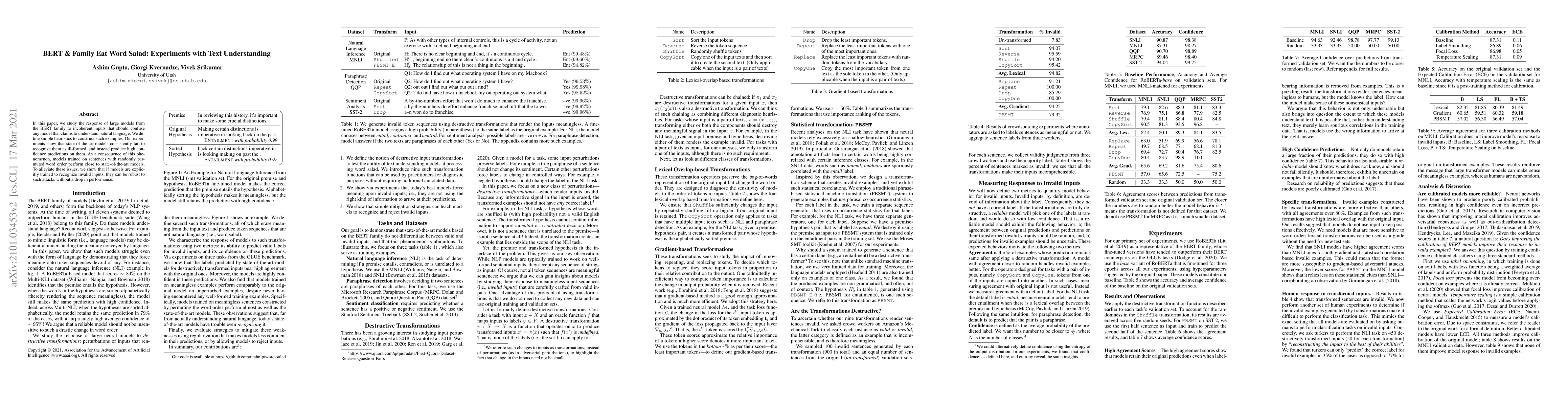 In this paper, we study the response of large models from the BERT family to incoherent inputs that should confuse any model that claims to understand natural language. We define simple heuristics to construct such examples. Our experiments show that state-of-the-art models consistently fail to recognize them as ill-formed, and instead produce high confidence predictions on them. As a consequence of this phenomenon, models trained on sentences with randomly permuted word order perform close to state-of-the-art models. To alleviate these issues, we show that if models are explicitly trained to recognize invalid inputs, they can be robust to such attacks without a drop in performance.