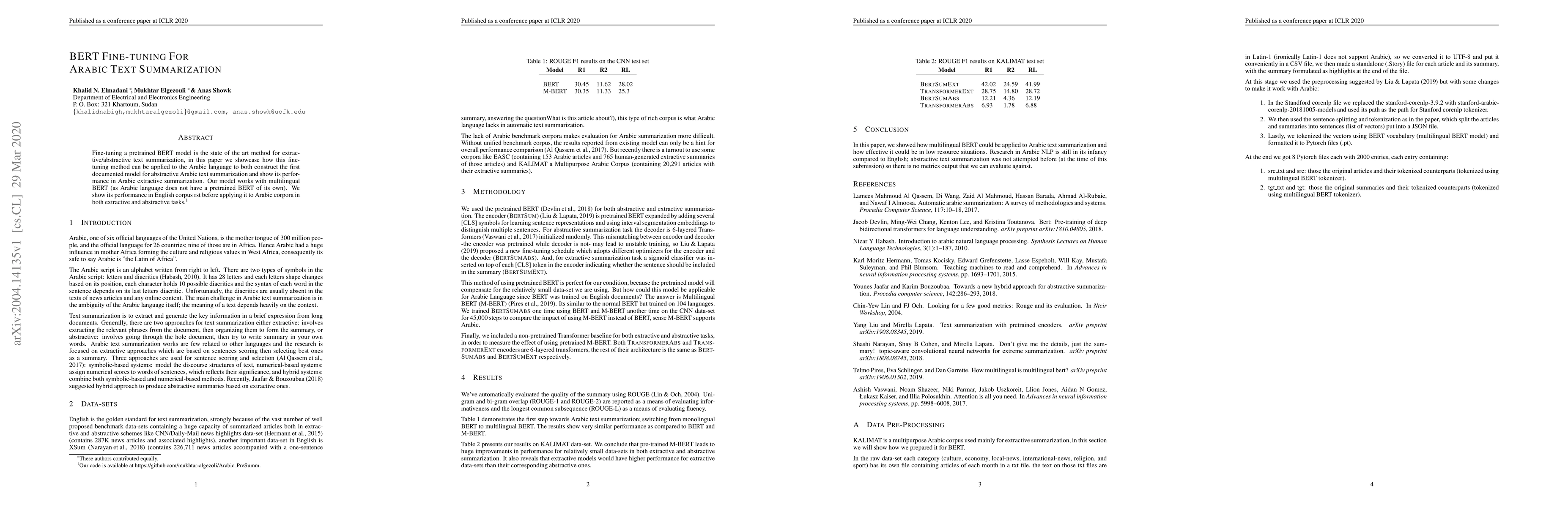 This paper fine-tunes a pretrained BERT model for Arabic text summarization, constructing the first documented abstractive summarization model for Arabic. The model, initially tested on English corpora, demonstrates performance in both extractive and abstractive summarization tasks for Arabic.
