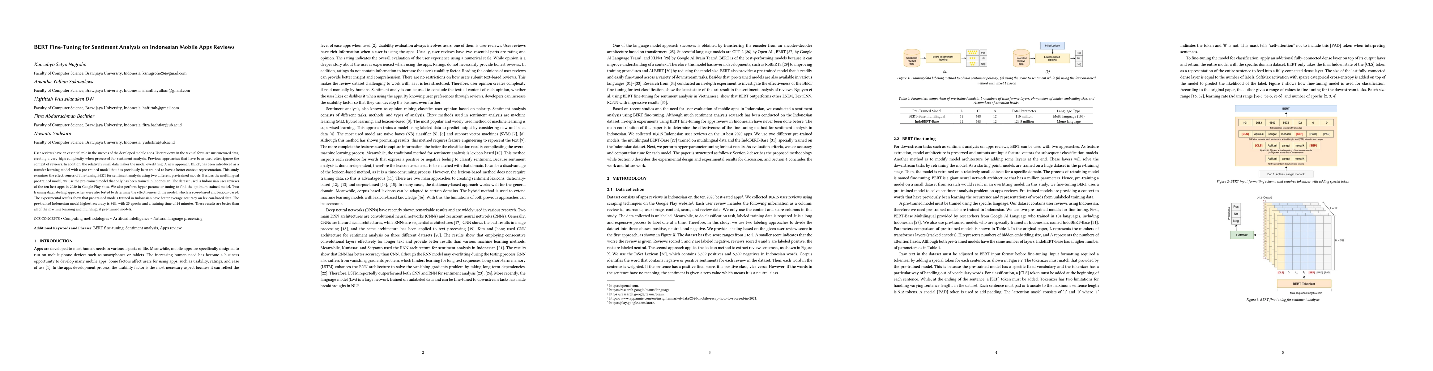 This study fine-tunes BERT for sentiment analysis on Indonesian mobile app reviews, comparing multilingual and Indonesian-specific pre-trained models. Results show that the Indonesian-specific pre-trained model achieves the highest accuracy of 84% with lexicon-based data labeling, outperforming other models.
