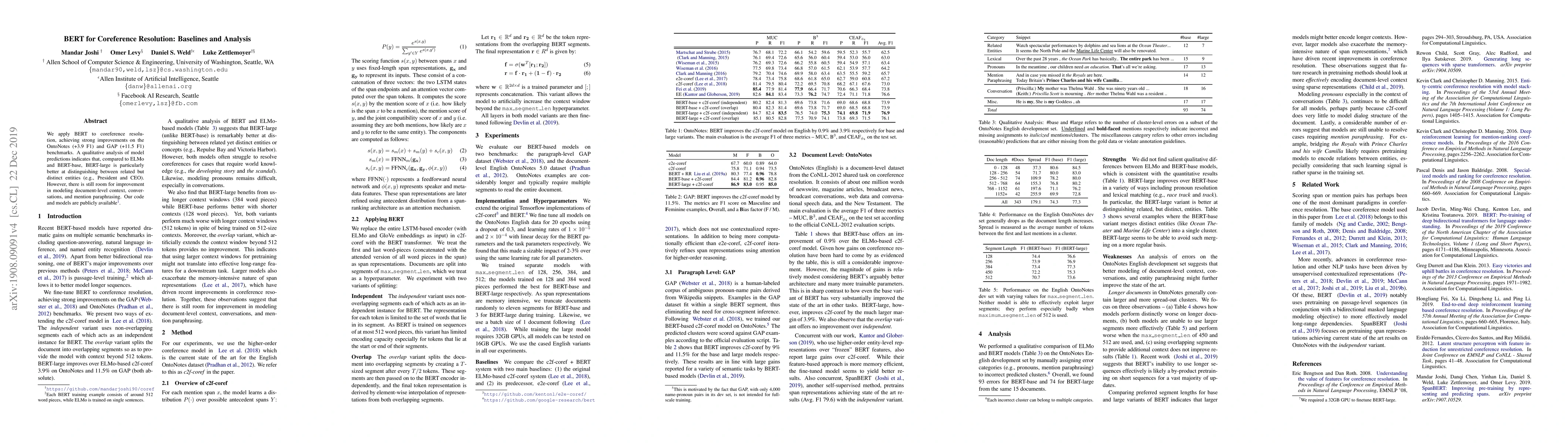 This paper applies BERT to coreference resolution, achieving significant improvements on OntoNotes and GAP benchmarks. BERT-large outperforms ELMo and BERT-base in distinguishing between similar entities, but challenges remain in context, conversations, and paraphrasing.