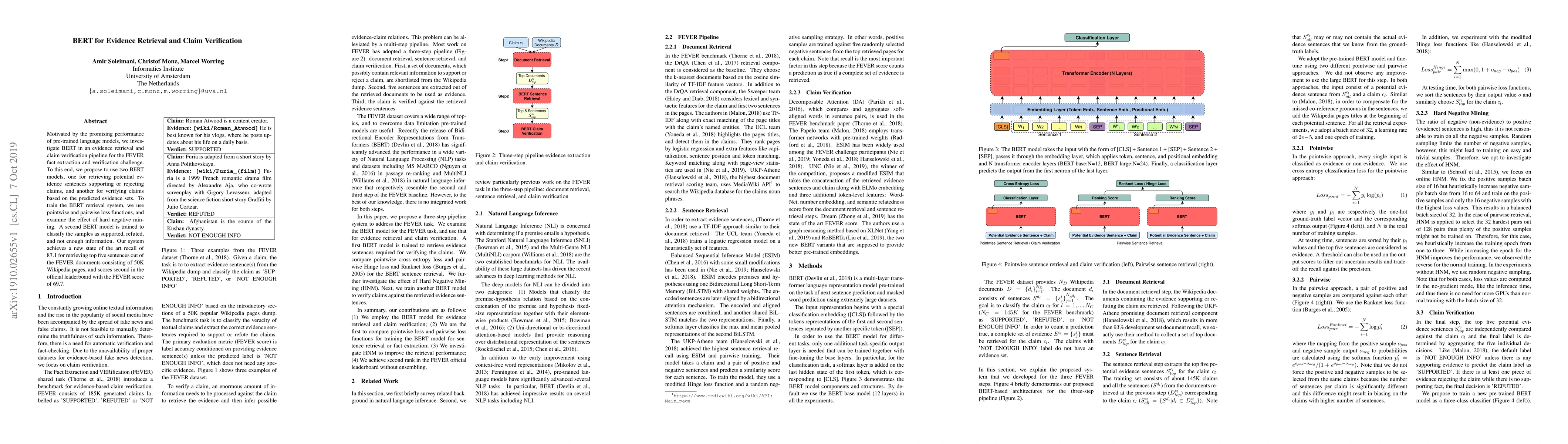 This paper explores using BERT for evidence retrieval and claim verification in the FEVER challenge, employing two BERT models: one for evidence retrieval and another for claim verification, achieving state-of-the-art recall and ranking second in the official leaderboard.