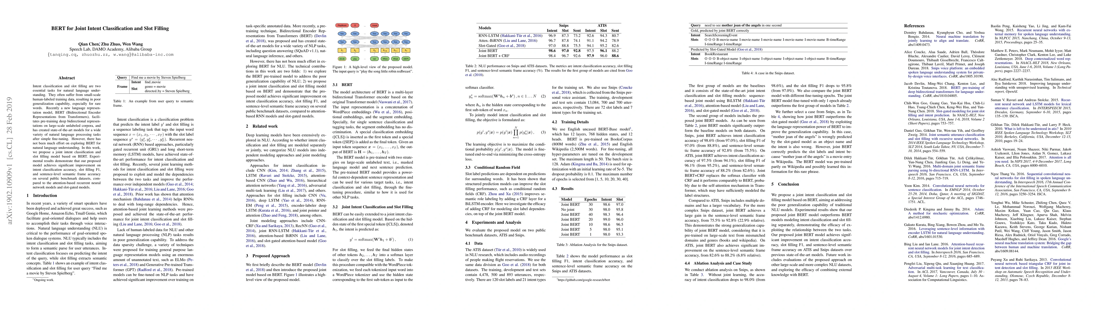 This paper proposes a joint intent classification and slot filling model utilizing BERT, showing significant improvements over attention-based RNN and slot-gated models on benchmark datasets. The BERT-based approach leverages pre-trained deep bidirectional representations to enhance performance, especially for rare words.
