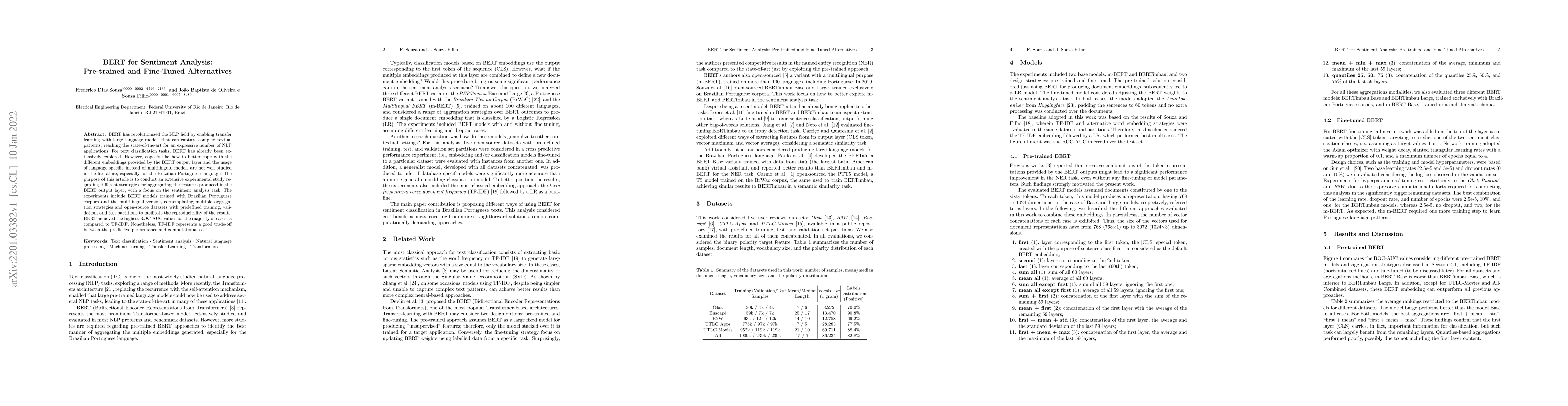 BERT has revolutionized the NLP field by enabling transfer learning with large language models that can capture complex textual patterns, reaching the state-of-the-art for an expressive number of NLP applications. For text classification tasks, BERT has already been extensively explored. However, aspects like how to better cope with the different embeddings provided by the BERT output layer and the usage of language-specific instead of multilingual models are not well studied in the literature, especially for the Brazilian Portuguese language. The purpose of this article is to conduct an extensive experimental study regarding different strategies for aggregating the features produced in the BERT output layer, with a focus on the sentiment analysis task. The experiments include BERT models trained with Brazilian Portuguese corpora and the multilingual version, contemplating multiple aggregation strategies and open-source datasets with predefined training, validation, and test partitions to facilitate the reproducibility of the results. BERT achieved the highest ROC-AUC values for the majority of cases as compared to TF-IDF. Nonetheless, TF-IDF represents a good trade-off between the predictive performance and computational cost.