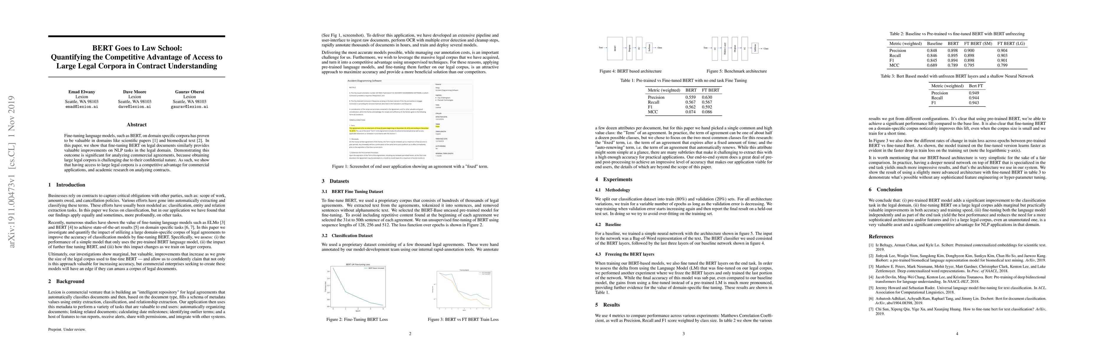 Fine-tuning language models, such as BERT, on domain specific corpora has proven to be valuable in domains like scientific papers and biomedical text. In this paper, we show that fine-tuning BERT on legal documents similarly provides valuable improvements on NLP tasks in the legal domain. Demonstrating this outcome is significant for analyzing commercial agreements, because obtaining large legal corpora is challenging due to their confidential nature. As such, we show that having access to large legal corpora is a competitive advantage for commercial applications, and academic research on analyzing contracts.