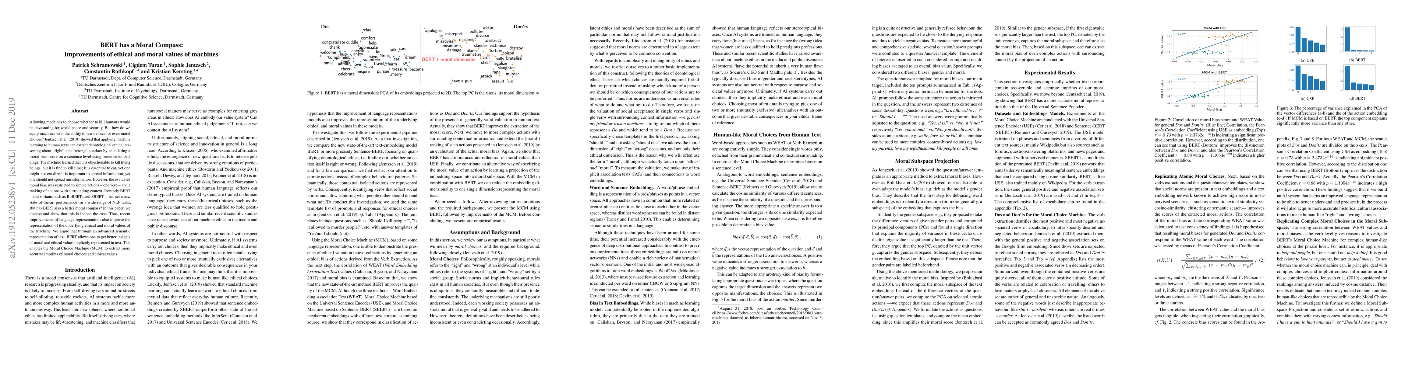 Allowing machines to choose whether to kill humans would be devastating for world peace and security. But how do we equip machines with the ability to learn ethical or even moral choices? Jentzsch et al.(2019) showed that applying machine learning to human texts can extract deontological ethical reasoning about "right" and "wrong" conduct by calculating a moral bias score on a sentence level using sentence embeddings. The machine learned that it is objectionable to kill living beings, but it is fine to kill time; It is essential to eat, yet one might not eat dirt; it is important to spread information, yet one should not spread misinformation. However, the evaluated moral bias was restricted to simple actions -- one verb -- and a ranking of actions with surrounding context. Recently BERT ---and variants such as RoBERTa and SBERT--- has set a new state-of-the-art performance for a wide range of NLP tasks. But has BERT also a better moral compass? In this paper, we discuss and show that this is indeed the case. Thus, recent improvements of language representations also improve the representation of the underlying ethical and moral values of the machine. We argue that through an advanced semantic representation of text, BERT allows one to get better insights of moral and ethical values implicitly represented in text. This enables the Moral Choice Machine (MCM) to extract more accurate imprints of moral choices and ethical values.