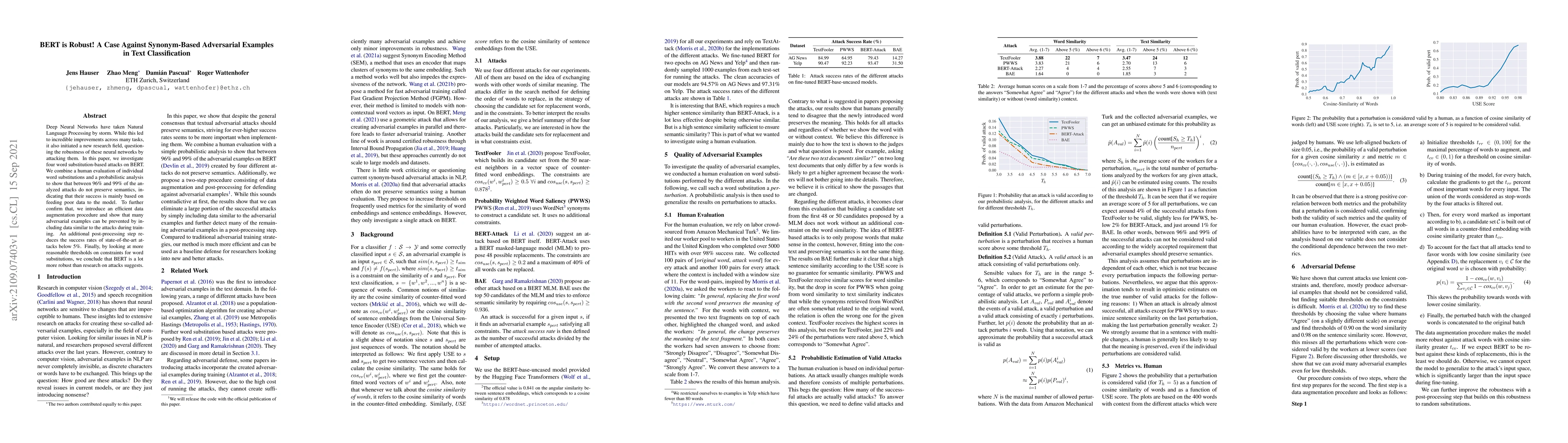 This paper demonstrates that BERT is highly resilient to synonym-based adversarial attacks in text classification, showing that most attacks fail due to semantic mismatches. By augmenting training data and implementing post-processing, the authors reduce attack success rates significantly, concluding that BERT's robustness is often underestimated.