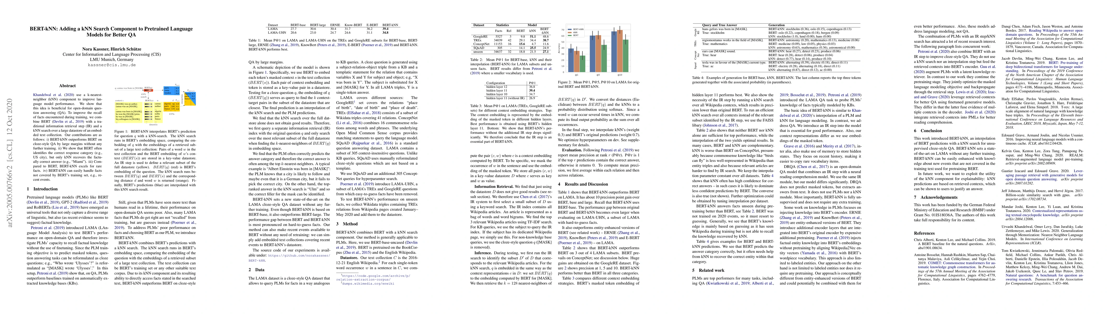 Khandelwal et al. (2020) enhance BERT's performance in open-domain QA by integrating a kNN search component, achieving superior recall and accuracy for rare facts and recent events without additional training. BERT-kNN outperforms BERT significantly on cloze-style QA tasks.