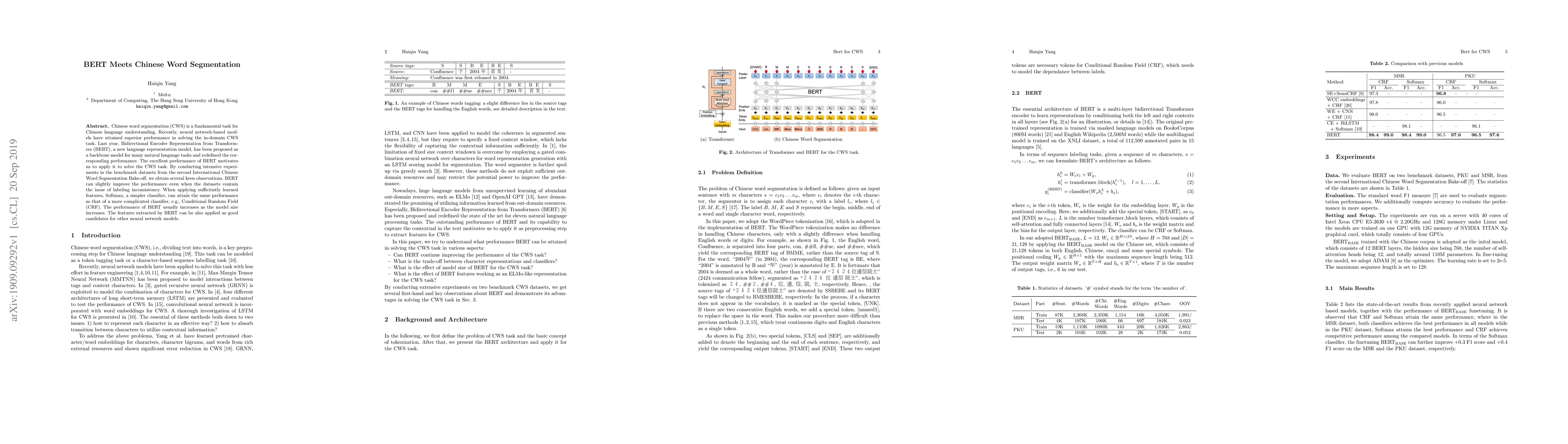 This paper investigates applying BERT to Chinese Word Segmentation (CWS), finding it can slightly enhance performance despite labeling inconsistencies. Notably, BERT's features can match the performance of more complex classifiers, and larger BERT models generally yield better results.