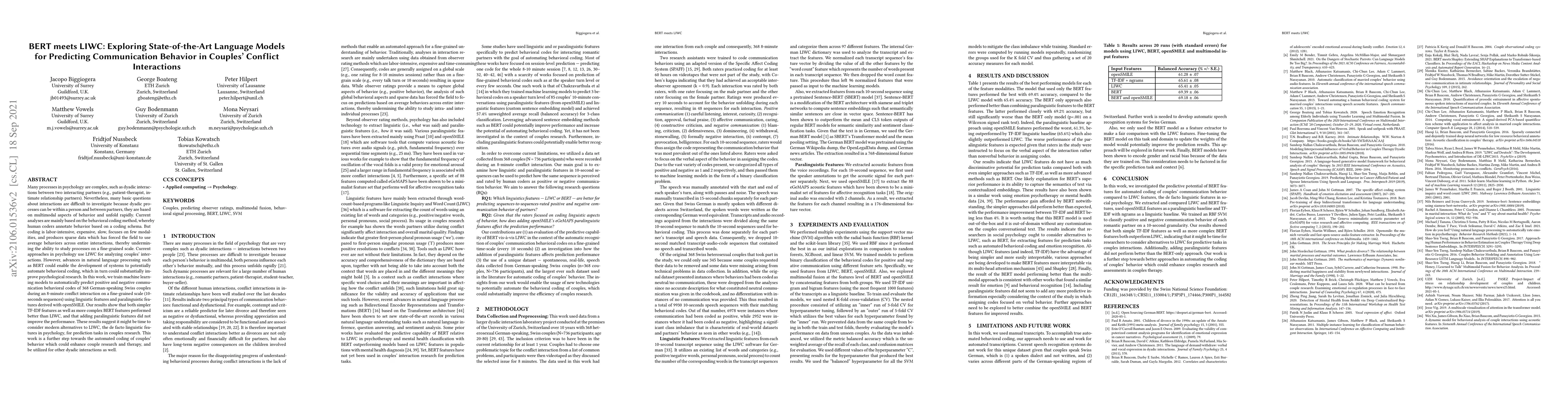 This study explores the use of BERT, a state-of-the-art language model, to predict communication behavior in couples' conflict interactions, comparing its performance to LIWC. The results show that BERT and TF-IDF features outperform LIWC, suggesting modern NLP techniques may replace traditional linguistic analysis in psychological research.