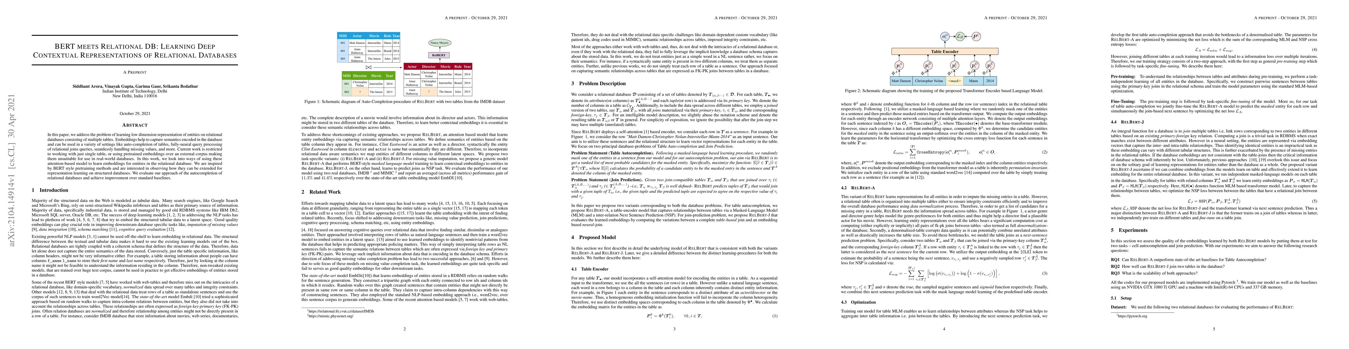 In this paper, we address the problem of learning low dimension representation of entities on relational databases consisting of multiple tables. Embeddings help to capture semantics encoded in the database and can be used in a variety of settings like auto-completion of tables, fully-neural query processing of relational joins queries, seamlessly handling missing values, and more. Current work is restricted to working with just single table, or using pretrained embeddings over an external corpus making them unsuitable for use in real-world databases. In this work, we look into ways of using these attention-based model to learn embeddings for entities in the relational database. We are inspired by BERT style pretraining methods and are interested in observing how they can be extended for representation learning on structured databases. We evaluate our approach of the autocompletion of relational databases and achieve improvement over standard baselines.