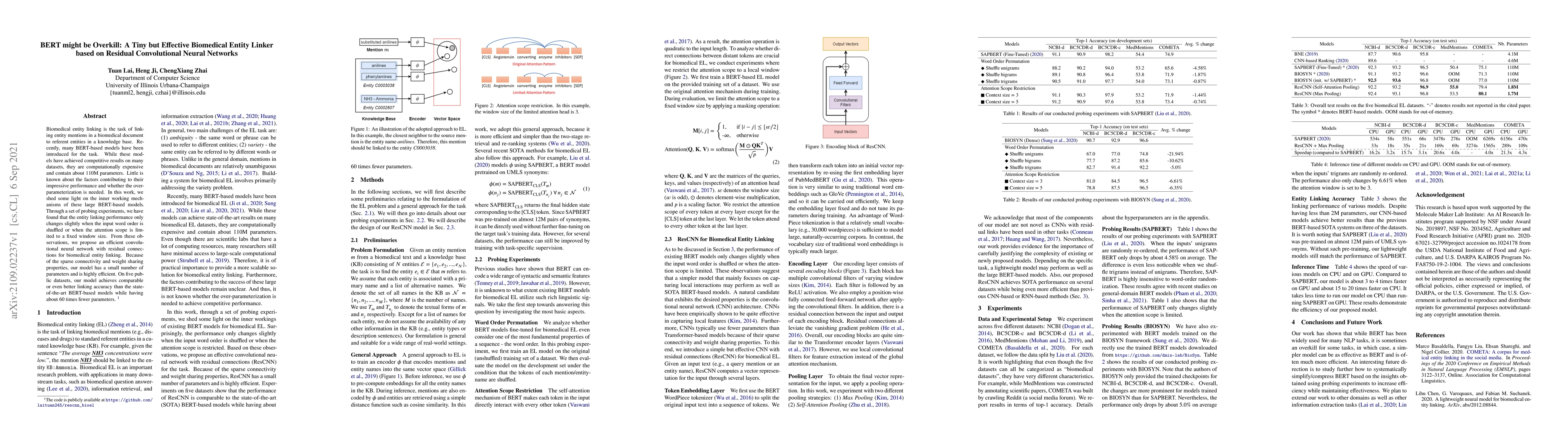This paper explores the efficiency of biomedical entity linking using a small, efficient convolutional neural network with residual connections, demonstrating that it achieves comparable or better performance than large BERT-based models, which are computationally expensive and contain about 110M parameters. The study finds that the impressive performance of BERT models may not require their extensive parameterization.